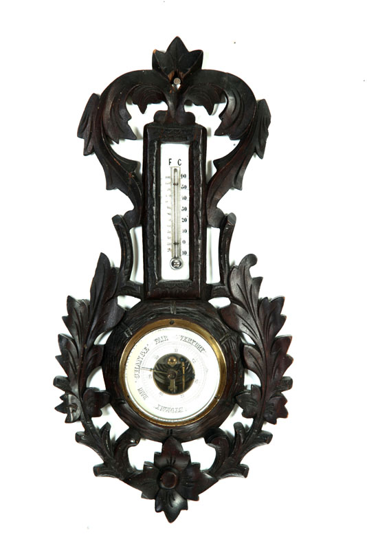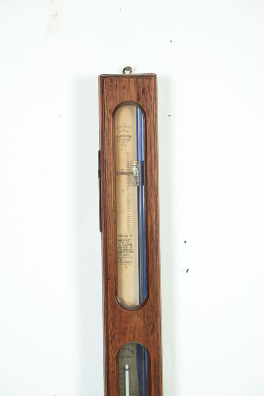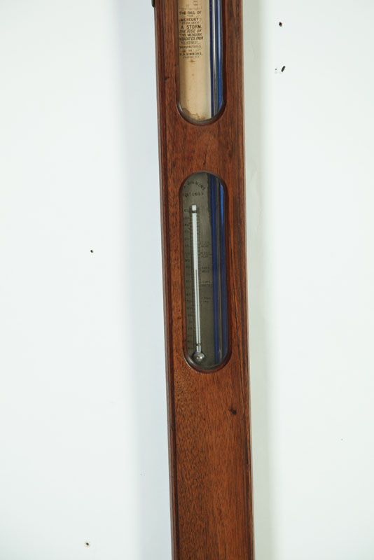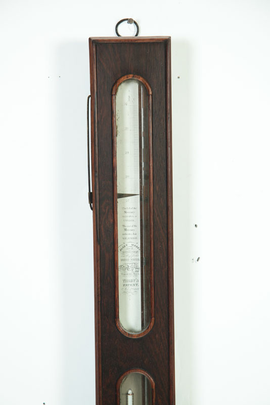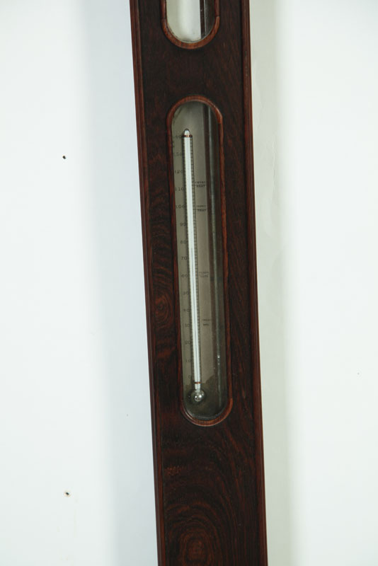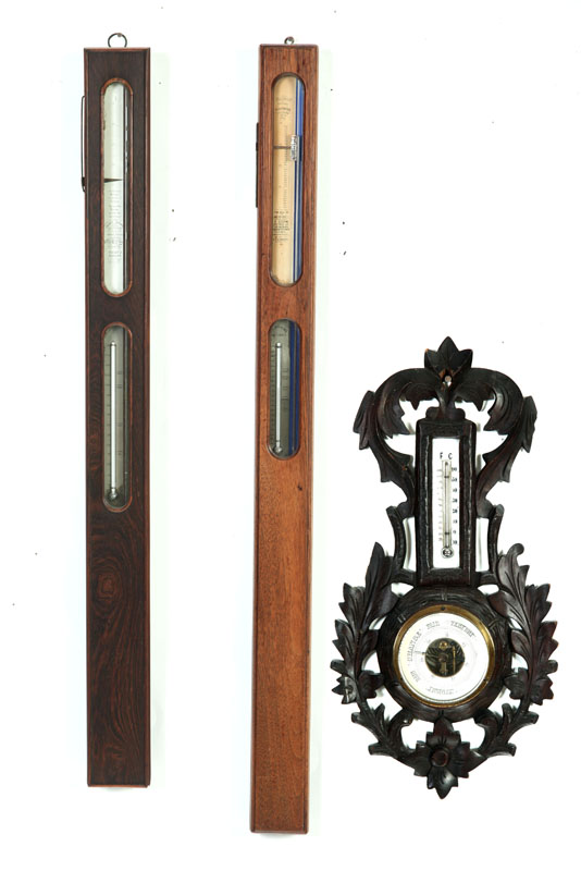 American, 2nd half-19th century. Two similar stick barometers in mahogany and rosewood with metal and paper labels. Simmons, New York and Alexander Marsh, Massachusetts. 37 1/2"l. Together with a round one in carved frame, 17 1/2"h. Imperfections.