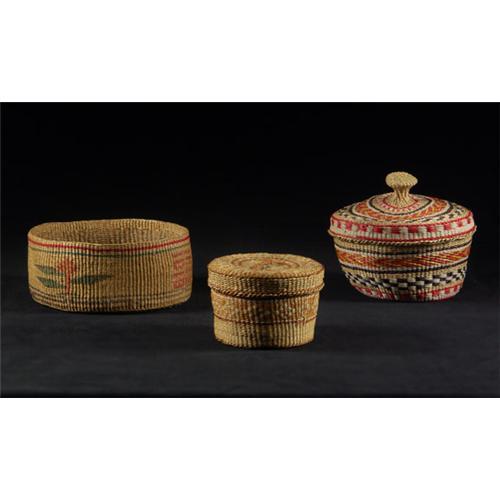 Three non-Native baskets. The first is a straight sided basket with lid, measures 3''H x 5'' diameter. The second is an Asian straight-sided bowl basket with polychrome floral design 3''H x 7'' diameter. The third basket is a bulbous basket with a knobbed lid, polychrome banding, 6 1/2''H x 6 1/2'' diameter.