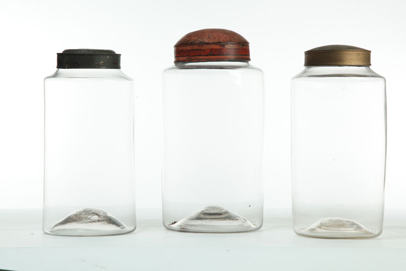 THREE BLOWN GLASS JARS WITH TIN LIDS