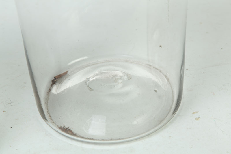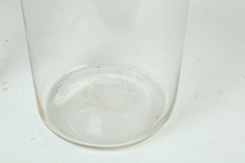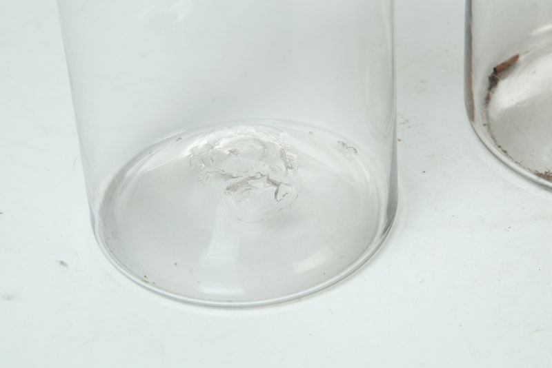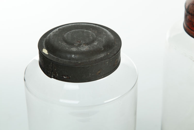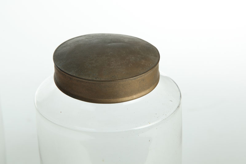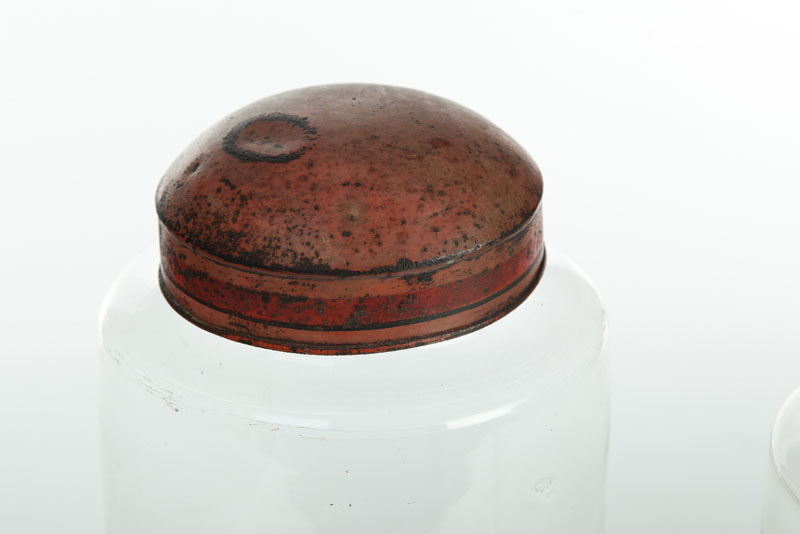 American, mid 19th century. Clear glass canisters with tin lids. One with original red tin lid and one with later gold painted lid. Slight imperfections. 12"h. to 13 3/4"h.