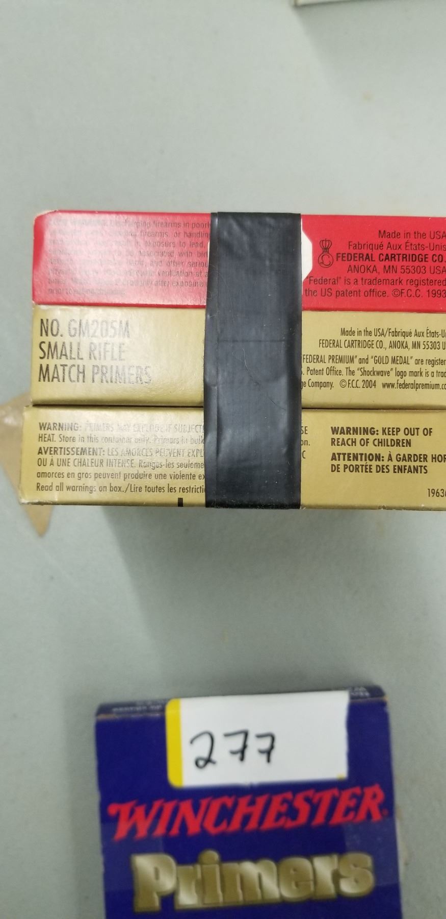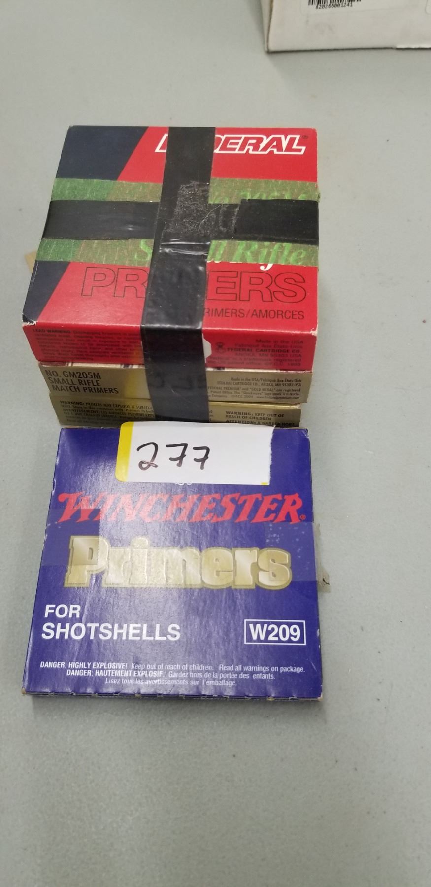 THREE BOXES OF FEDERAL SMALL RIFLE PRIMERS PLUS ONE BOX OF WIN W209 SHOT SHE PRIMERS