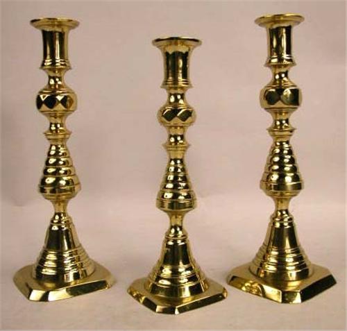 THREE BRASS BEEHIVE- FORM PUSHUP CANDLE STICKS; Tallest 10"h
