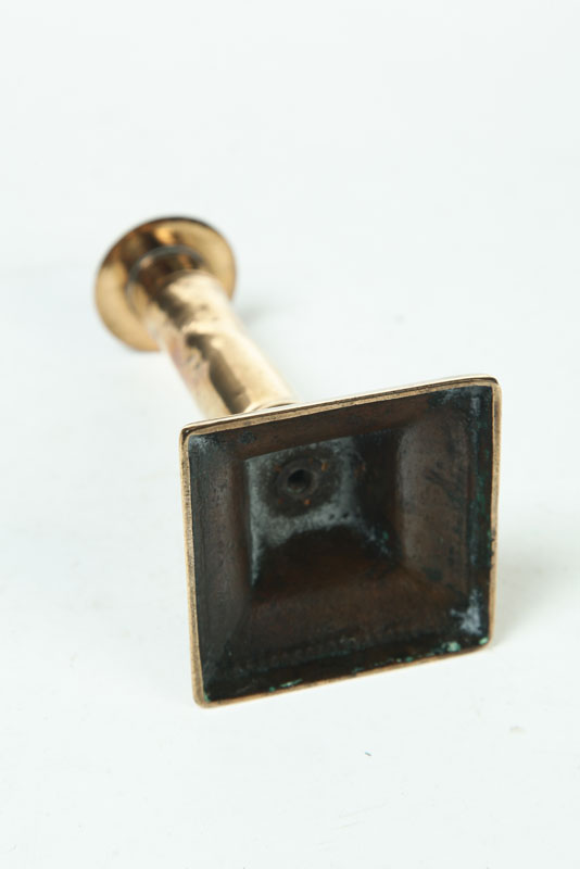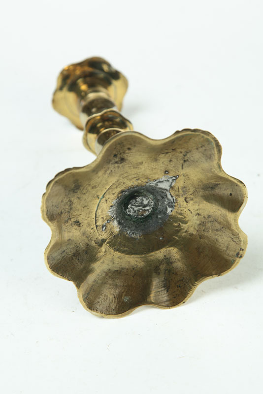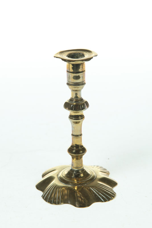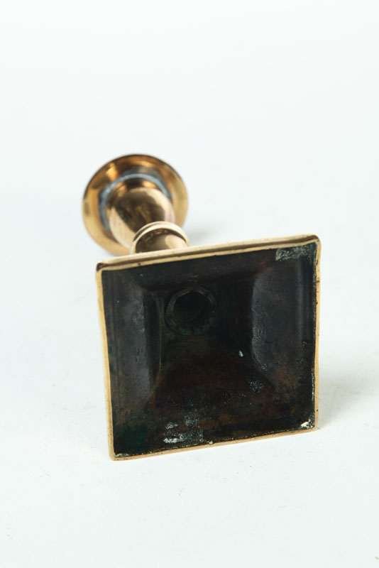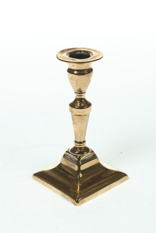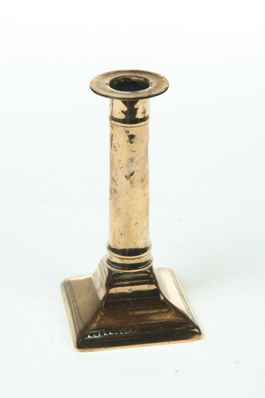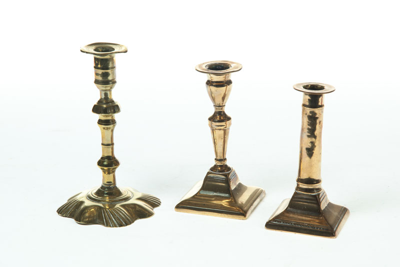 England, 18th century. Two with square bases, 6", 6 1/2"h., one with seamed construction and scalloped base, 7"h. Imperfections.