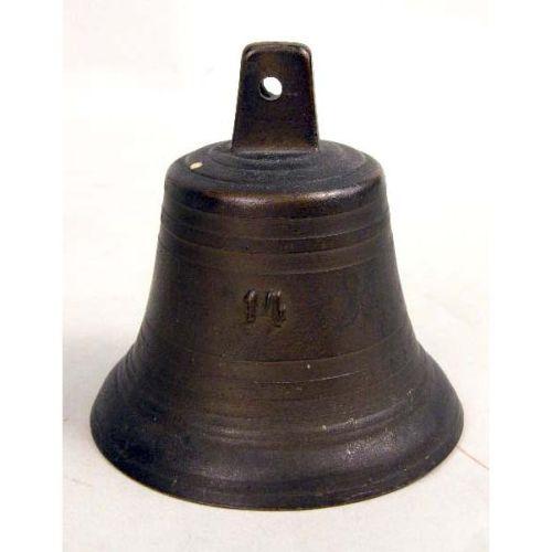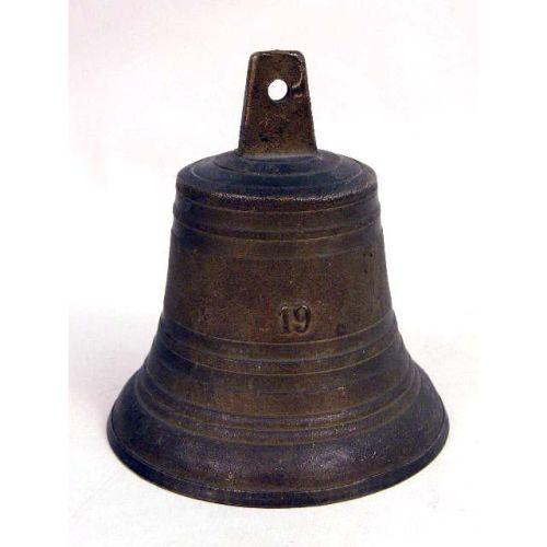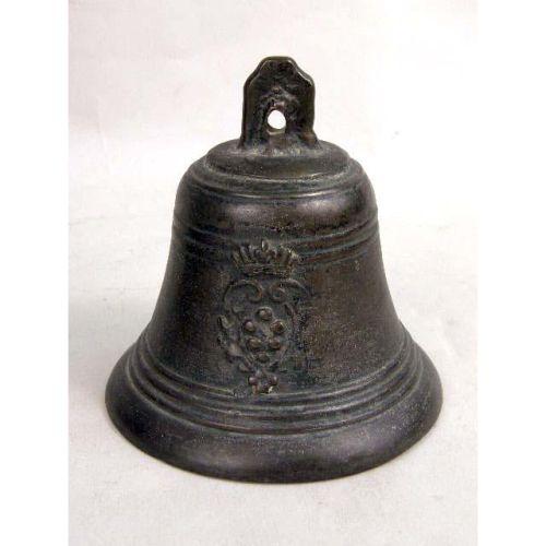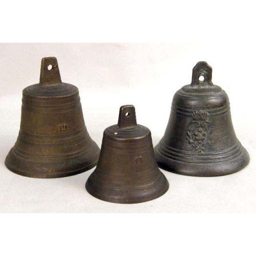 THREE BRONZE BELLS OF VARYING SIZES<BR><BR>each embossed "1878 Saignelegier / Chiantel Fondeur". Together with a goat- or cowbell embossed "A Paris / 5". Heights from 3 1/2" - 5". 4 pieces.