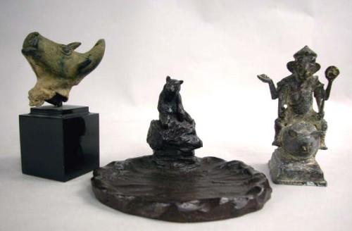 THREE BRONZE TABLE ARTICLES; Including a bull's head, a bear-form ashtray and an Asian figure From 3 1/2"h to 4 3/4"h