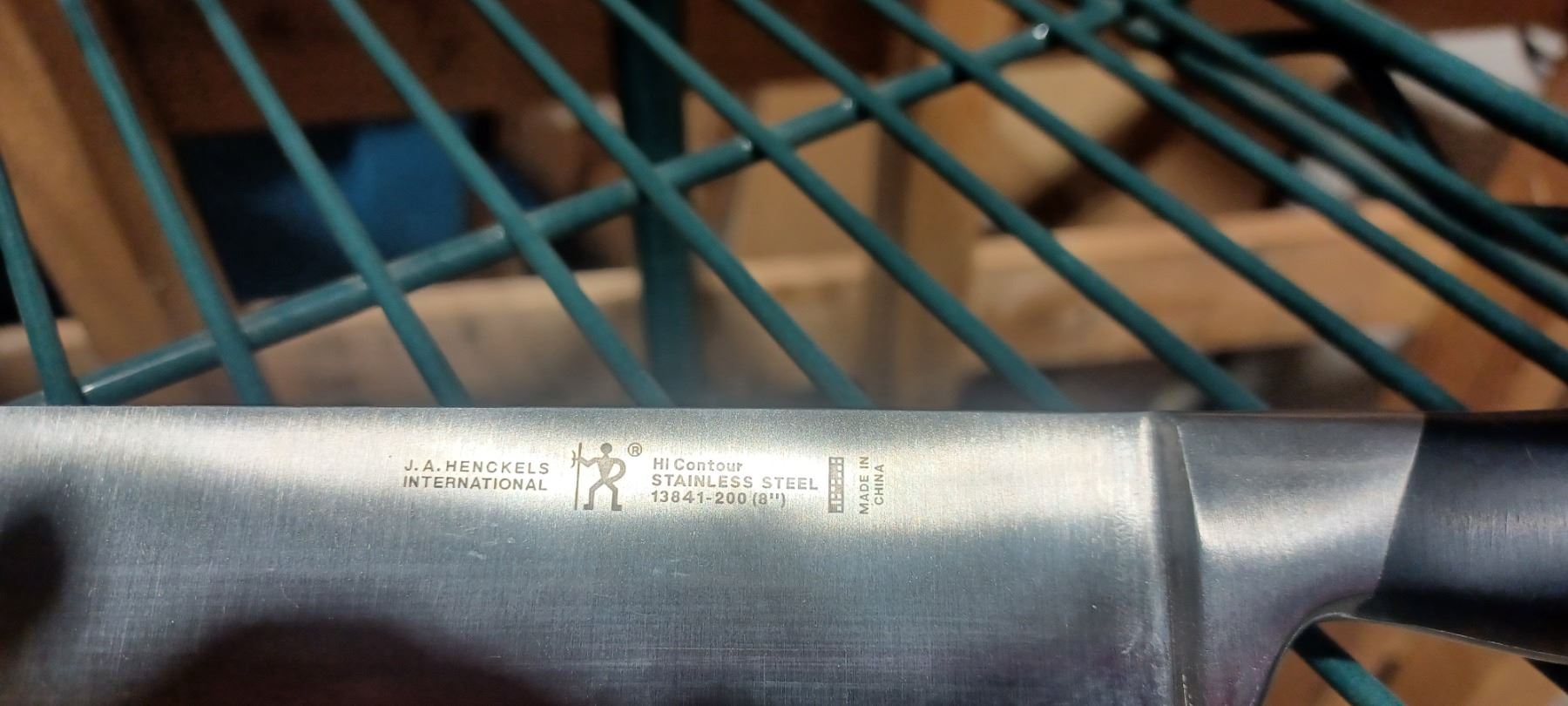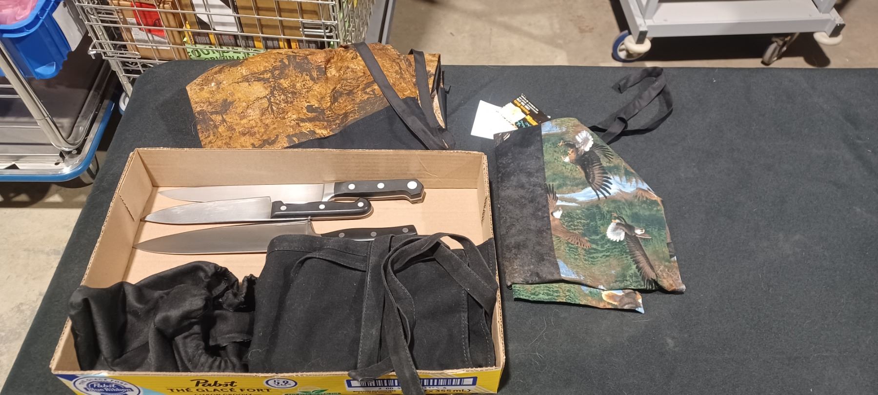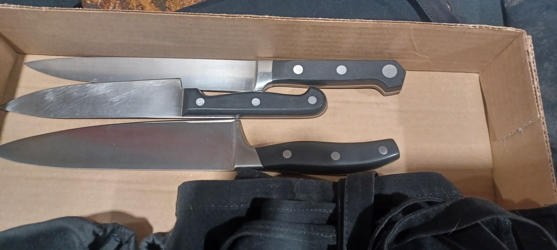 THREE BUTCHER KNIVES (ONE HENKL) AND THREE APRONES