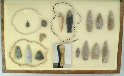 THREE CASES OF ASSORTED INDIAN ARTIFACTS. 1) Case of drills and perforators. Fair to good. 2) Quartz and chert projectile points of various time periods. Fair to very good. 3) Larger case with two necklaces of shell beads, one necklace of glass trade beads, several drilled items, preforms and blades out of muldraugh chert. One large Cumberland fluted point and one large Doulton green briar. Good to very good. CONDITION: As noted above. 9-25984-127 The Tennessee Collection of Prehistoric Indian Artifacts from the Allen Graves Estate. SPECIAL NOTE: We do not regularly sell Prehistoric Indian stone artifacts and therefore have very little experience and no expertise in this area. All of the following lots have come from the Collection of the Late Allen Graves of Tennessee. The collection was inherited some years back by his daughter, who now lives in Maine. This collection was consigned to us directly from her. We employed someone to generally identify styles and types, but as stated above, due to our lack of expertise in this field, we can not guarantee the age or origin of the following pieces. We are relying on you, the buyer, to determine to your satisfaction the origin and age of each item in the collection.