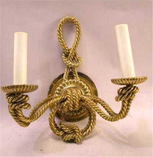 THREE CAST BRASS TWO-LIGHT WALL SCONCES; Designed to look like knotted rope, 10 1/2"h x 10"w