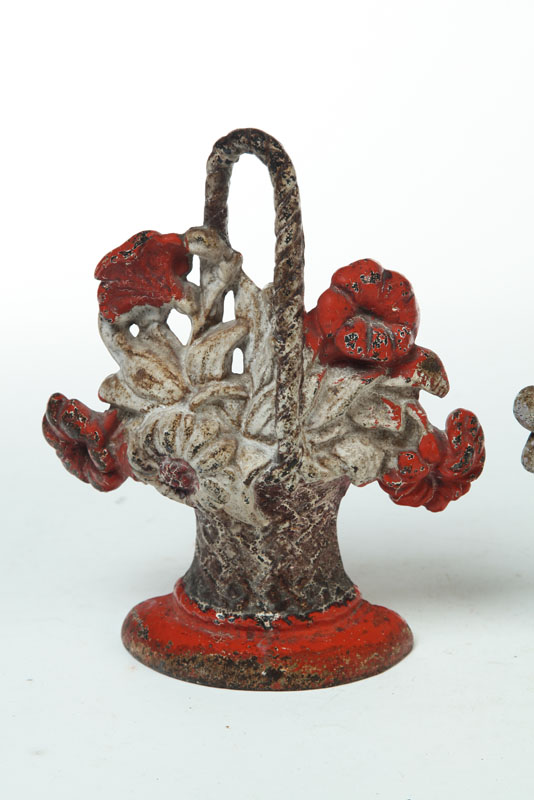 American. early 20th century. Two of the floral baskets match in form and resemble Hubley's Rose Basket", one appears to have the original paint. 9 1/2"h. And a similar basket, 9 1/2"h.