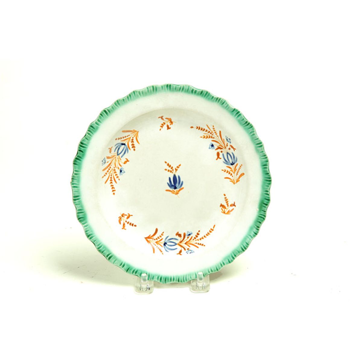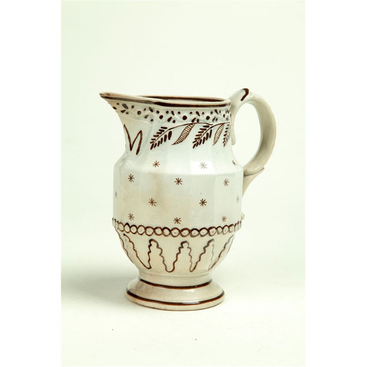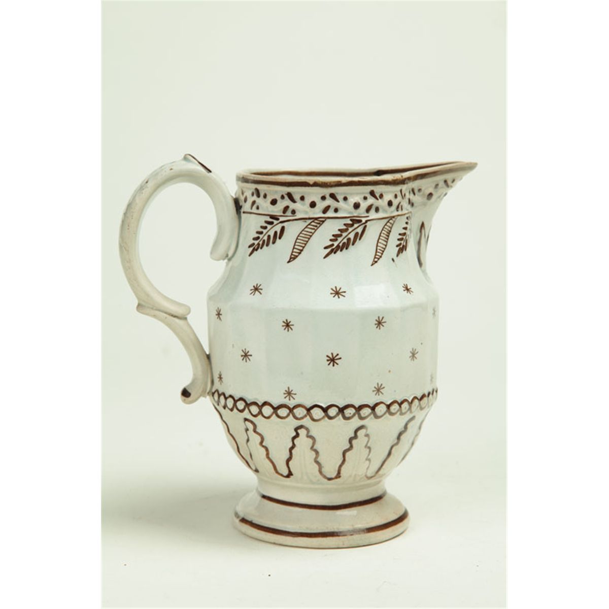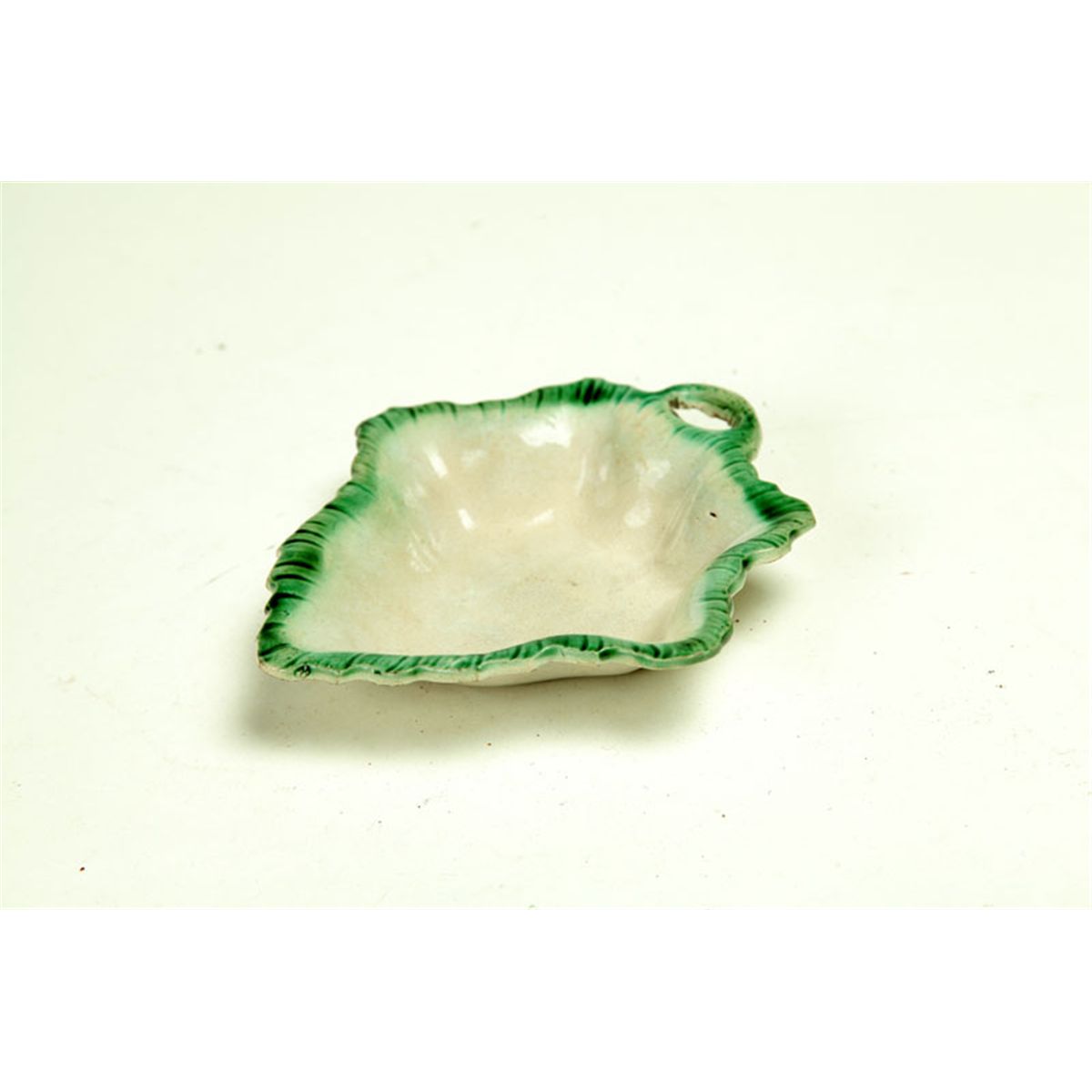 England, early 19th century. Two green feather edge pieces. Plate with anchor mark and Leeds decoration, 8"d., and a leaf-shaped dish with handle, 5 1/2"l. Together with a paneled pearlware pitcher with brown stars and leaves, 6 1/4"h.