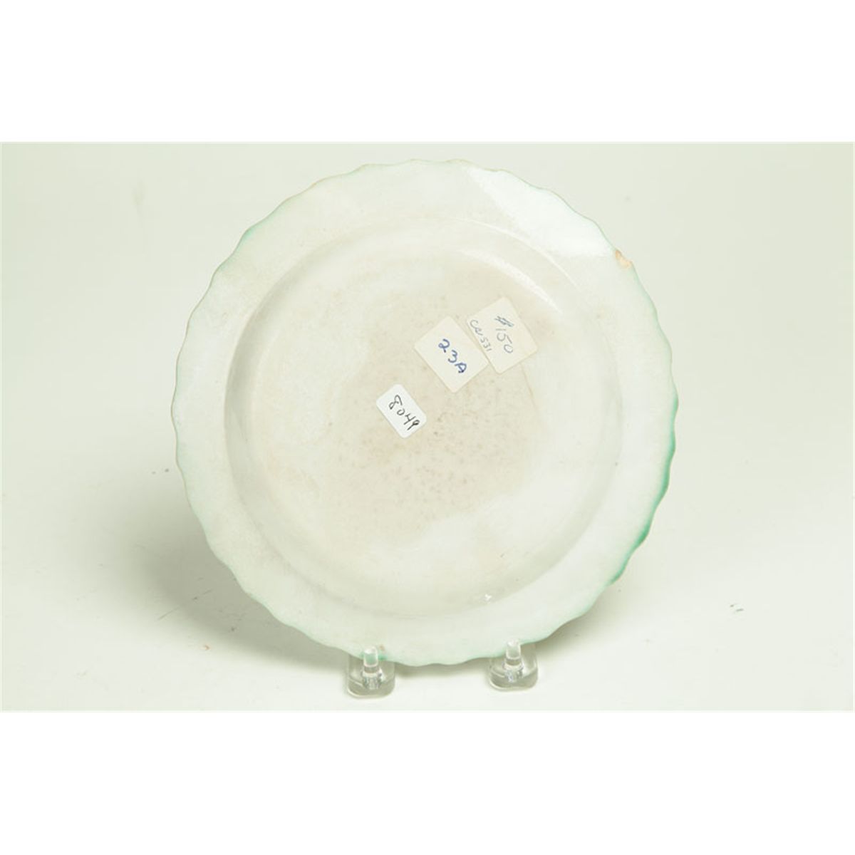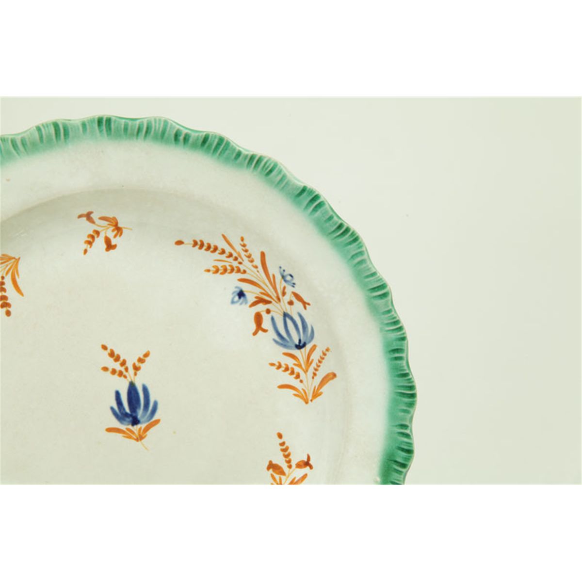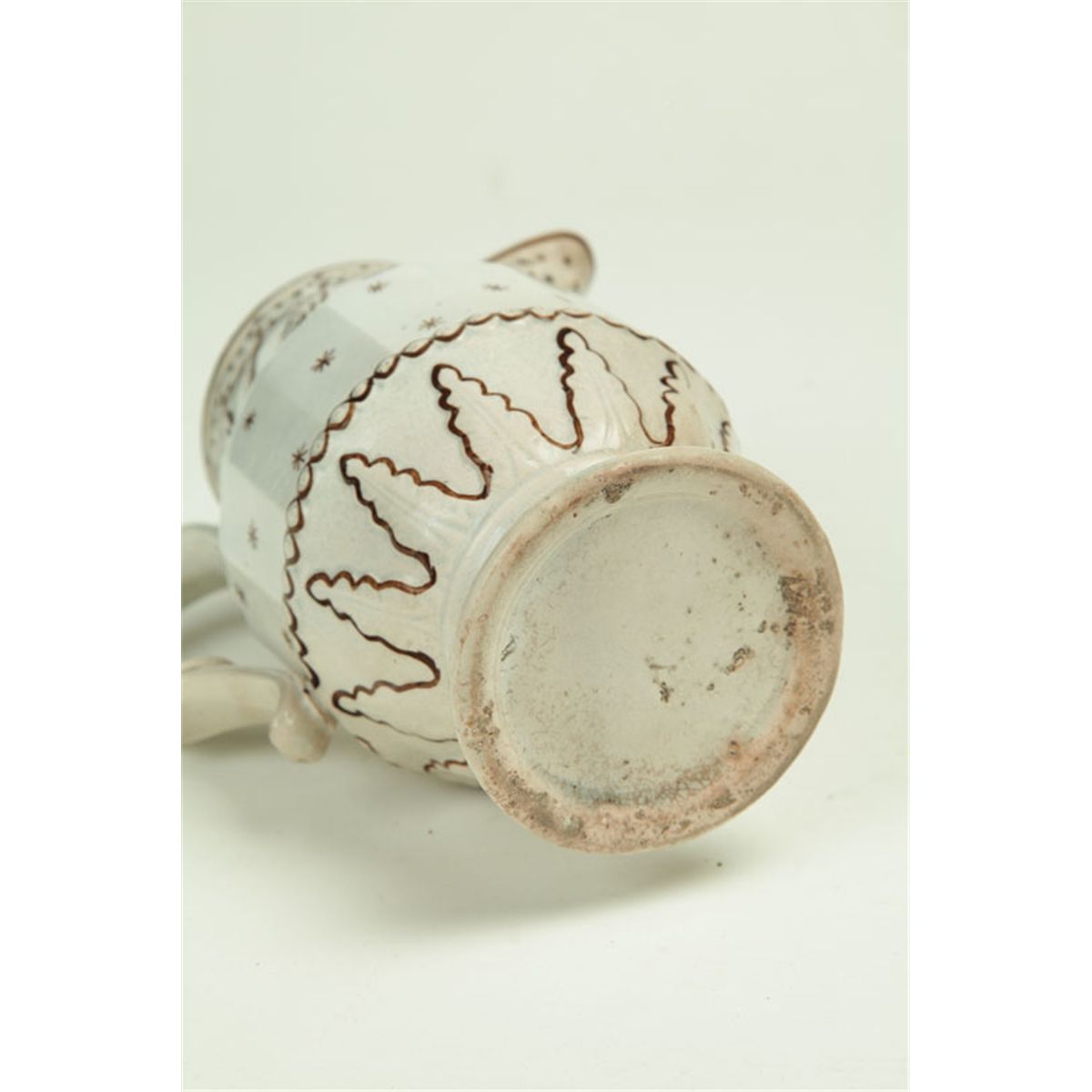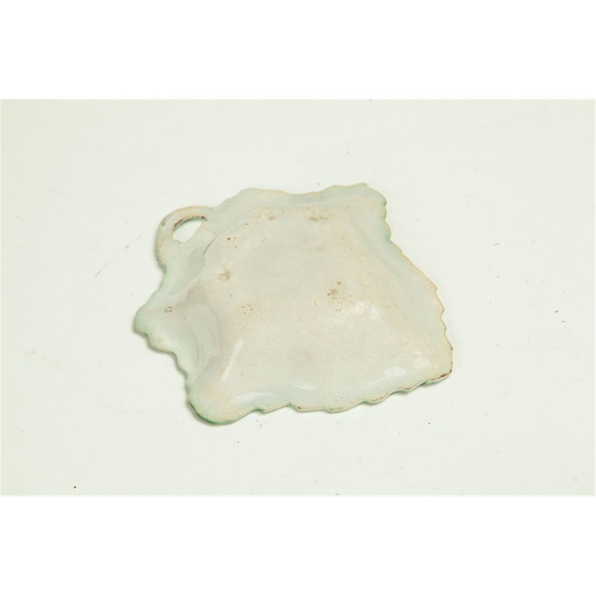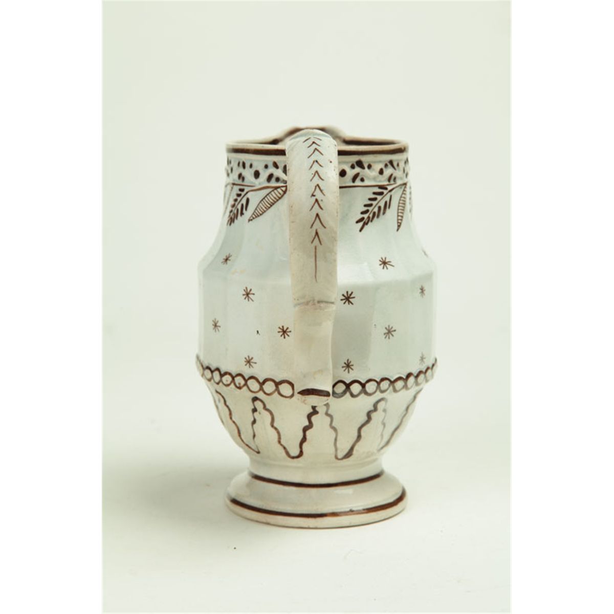 England, early 19th century. Two green feather edge pieces. Plate with anchor mark and Leeds decoration, 8"d., and a leaf-shaped dish with handle, 5 1/2"l. Together with a paneled pearlware pitcher with brown stars and leaves, 6 1/4"h.