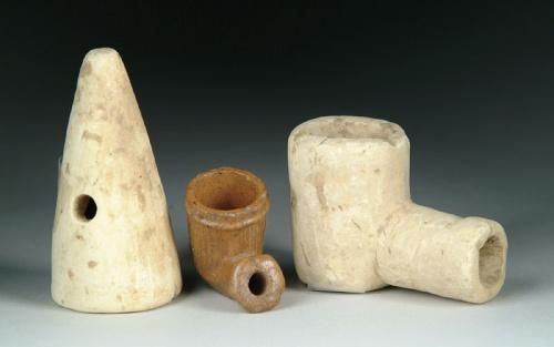 THREE CERAMIC PIPES. Two Proto-Historic elbow pipes, one Historic salt glazed pipe from Point Pleasant, Ohio. Two Proto-Historic Circa 1300-1600AD style; Point Pleasant Circa 1870. SIZES: Largest is 3-1/4in. l x 1-1/2in.; smallest is 2in. l x 1-1/2in.. CONDITION: Very good. 9-25984-48 The Tennessee Collection of Prehistoric Indian Artifacts from the Allen Graves Estate. SPECIAL NOTE: We do not regularly sell Prehistoric Indian stone artifacts and therefore have very little experience and no expertise in this area. All of the following lots have come from the Collection of the Late Allen Graves of Tennessee. The collection was inherited some years back by his daughter, who now lives in Maine. This collection was consigned to us directly from her. We employed someone to generally identify styles and types, but as stated above, due to our lack of expertise in this field, we can not guarantee the age or origin of the following pieces. We are relying on you, the buyer, to determine to your satisfaction the origin and age of each item in the collection.