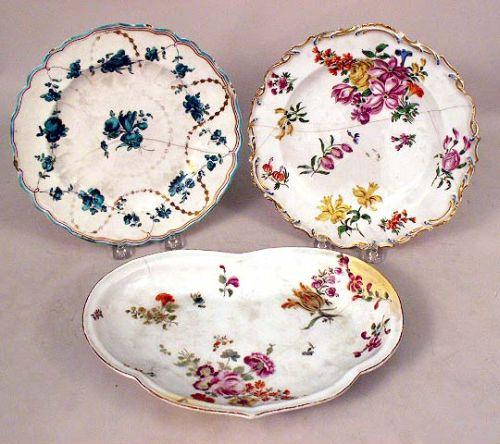 The first heart shaped with floral motif, the underside marked with a brown anchor, the second with underside marked with a gold anchor, and the third with underside marked with a red anchor. Chips, cracks, and repairs.