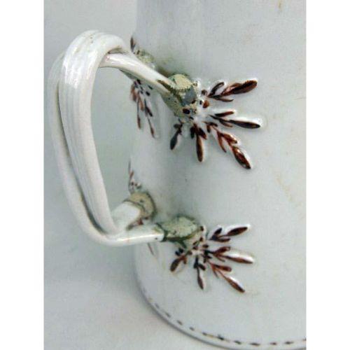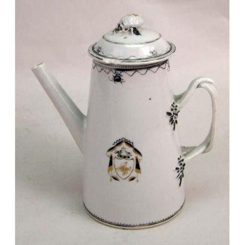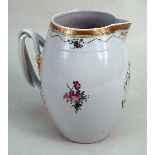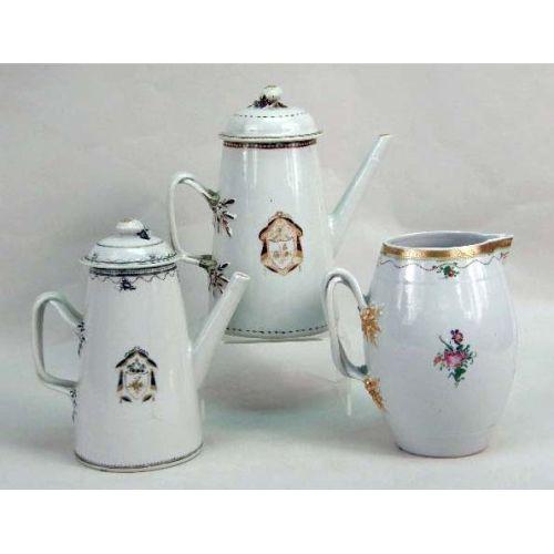 THREE CHINESE EXPORT POLYCHROME AND PARCEL-GILT DECORATED TABLE ARTICLES<BR><BR>Comprising, two coffee pots, with lids, and a pitcher, chips, repairs