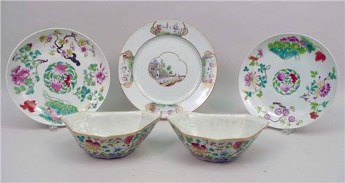 Comprising a pair of shaped bowls and a circular dish. Together with two similarly decorated porcelain dishes. 5 pieces. 2 1/2"h x 8"w x 5 1/2"d to 9"dia.
