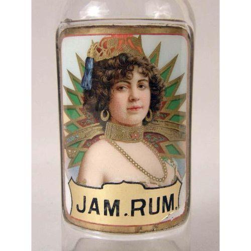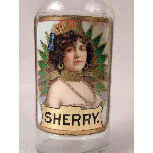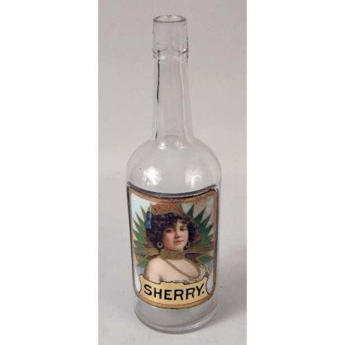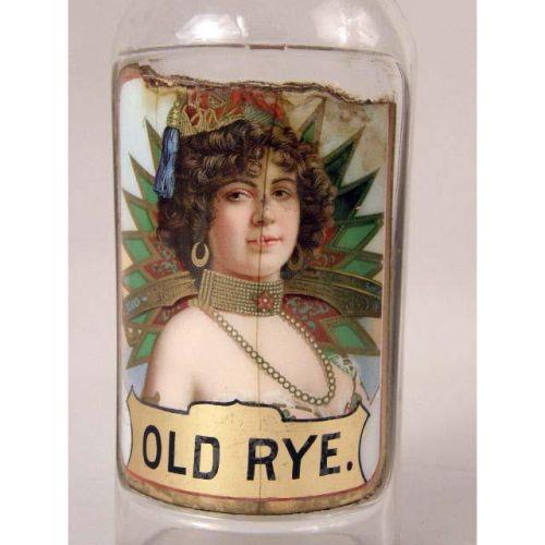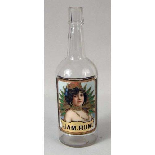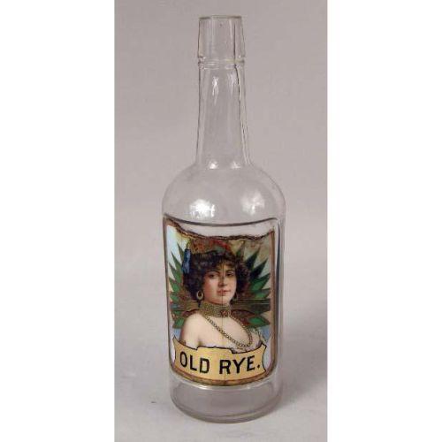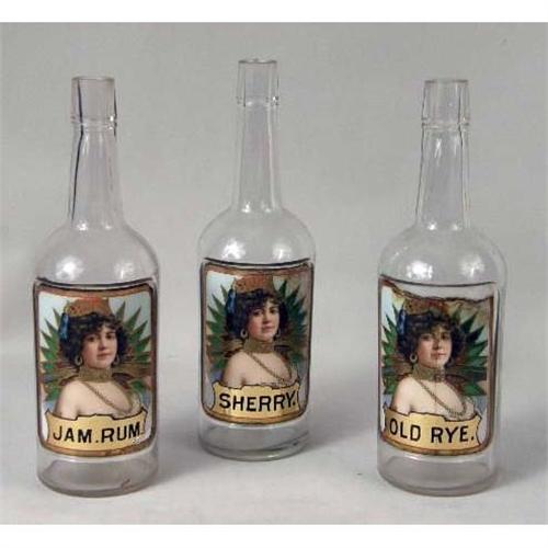 THREE COLORLESS GLASS BAR BOTTLES<BR><BR>once belonging to Jack Kriendler, co-founder of the legendary "21" club and speakeasy. The labels under the glass depicting beautiful women, and labeled "Old Rye," "JAM Rum," and "Sherry,". Losses and cracks, 11-1/2"h