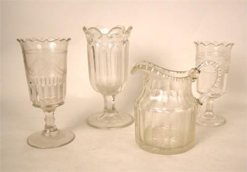 THREE COLORLESS GLASS CELERY JARS; Together with a pitcher, losses Tallest:10"h