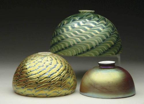 THREE CONTEMPORARY SHADES. 1) Gold iridescent shade has white cased interior with highlights of purple and pink at the collar. SIZE: 6-3/4" dia. CONDITION: Some chips to inside fitter. 2) Gold iridescent shade has green wavy damascene design with a white interior. SIZE: 8" dia at the widest x 7-1/2" fitter. CONDITION: Very good to excellent. 3) Green and gold iridescent damascene design with translucent white interior. SIZE: 10" dia x 2-1/4" fitter at top. CONDITION: Some roughness to fitter, otherwise good. 5-61858