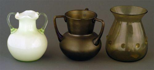 THREE CONTINENTAL PIECES OF BLOWN ART GLASS including a cased green vase with handles, stamped "Czechoslovakia"; an olive colored glass vase with applied prunts; and a dark olive/brown iridescent vase with three handles, ranging from 5 1/2" - 6" high