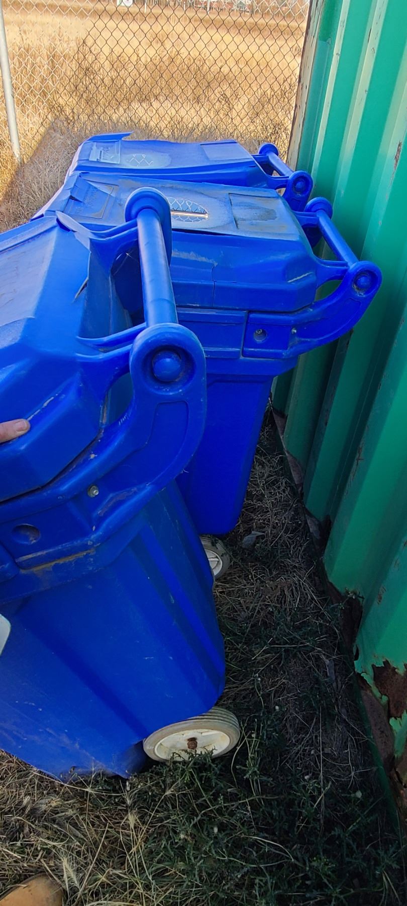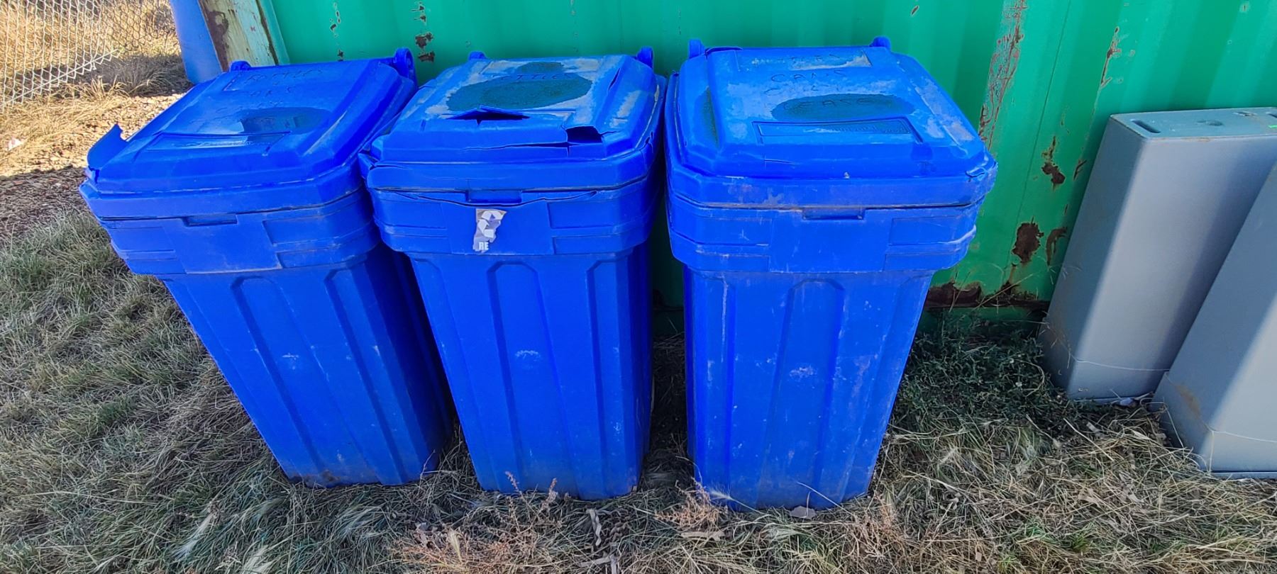 THREE CONTINENTAL TRASH CANS ON ROLLER WHEELS (LIDS ARE DAMAGED)