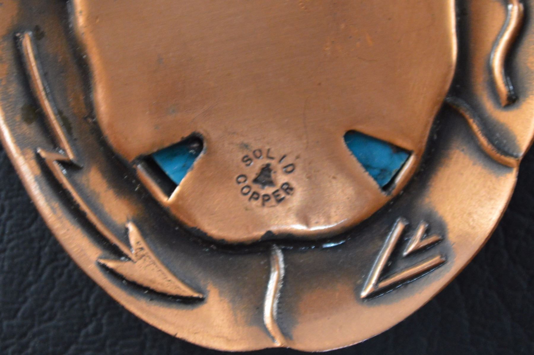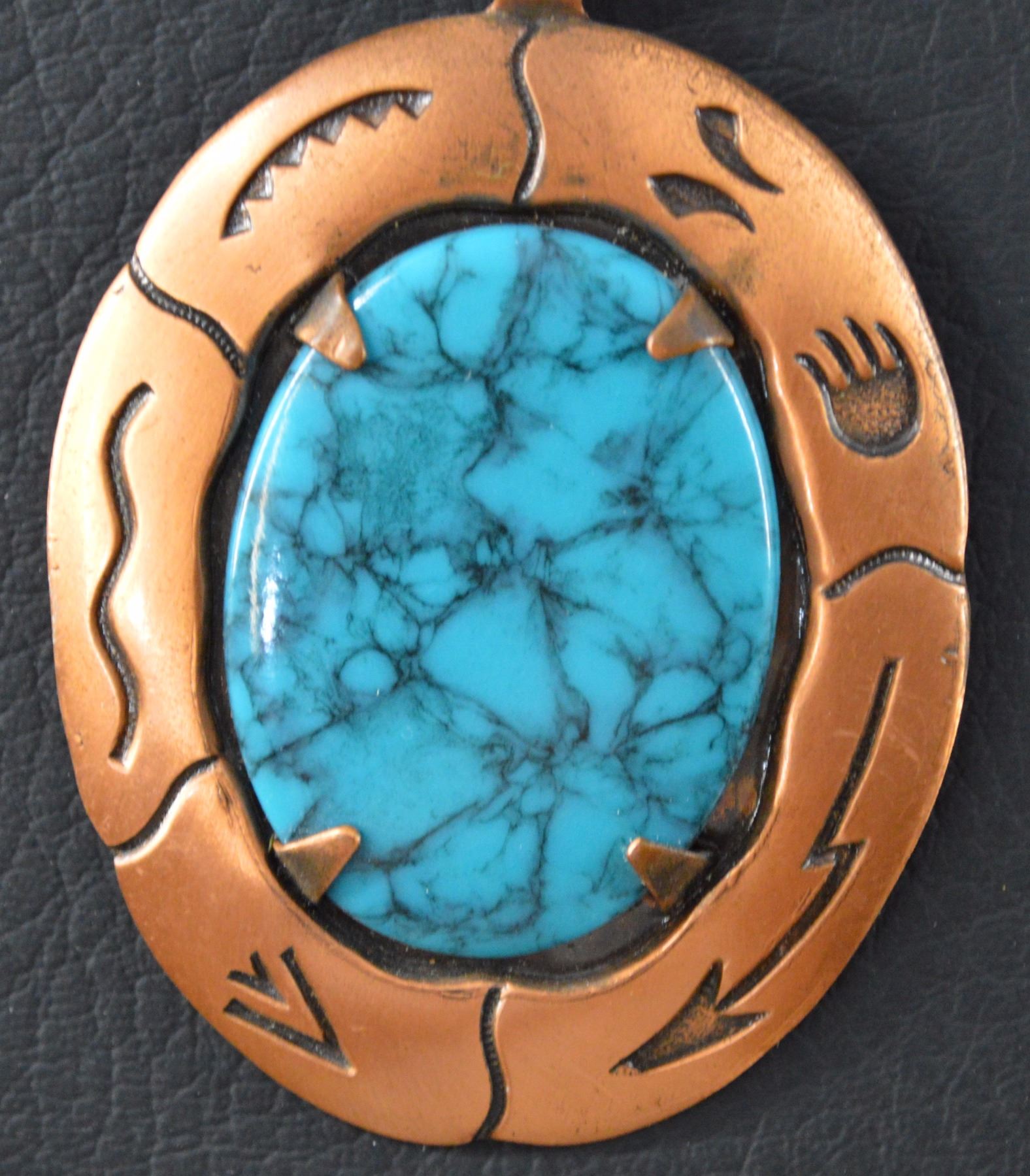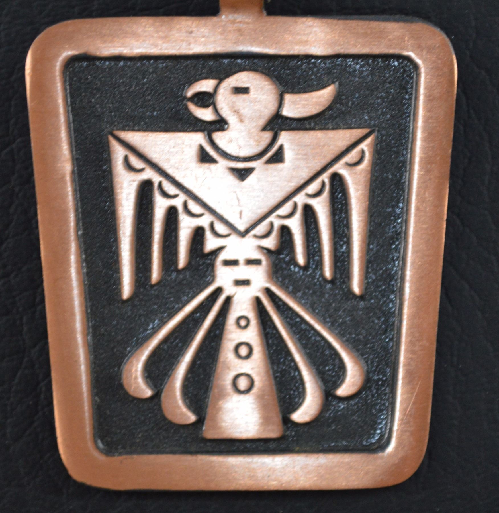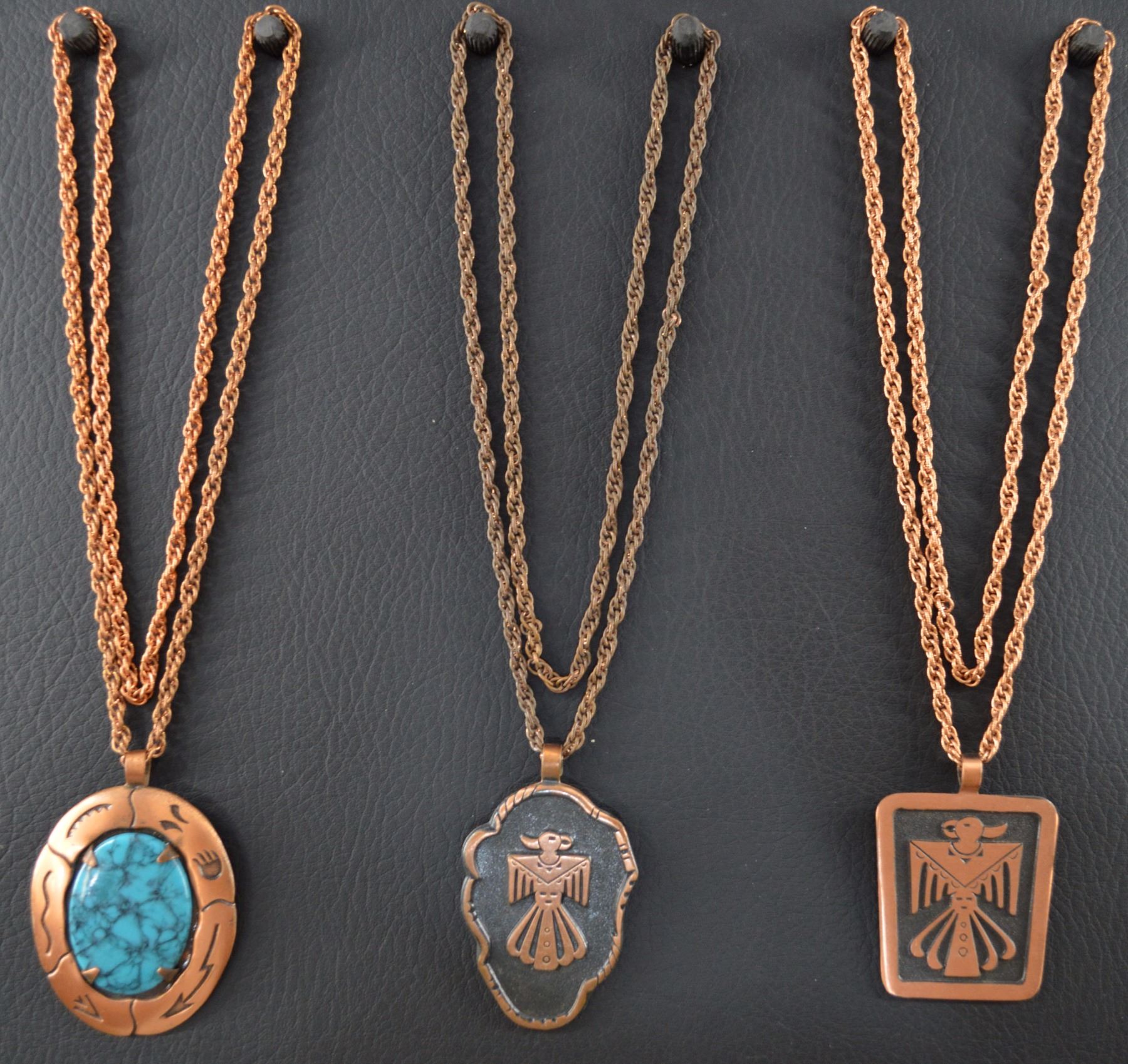 1980-90's. Hand made Copper chain 28" long. Two with bump out bird design, 1.75" x 2.5". Pressed Anasazi style design with green stone, 2" x 2.5". All have Bell Trading Hallmark