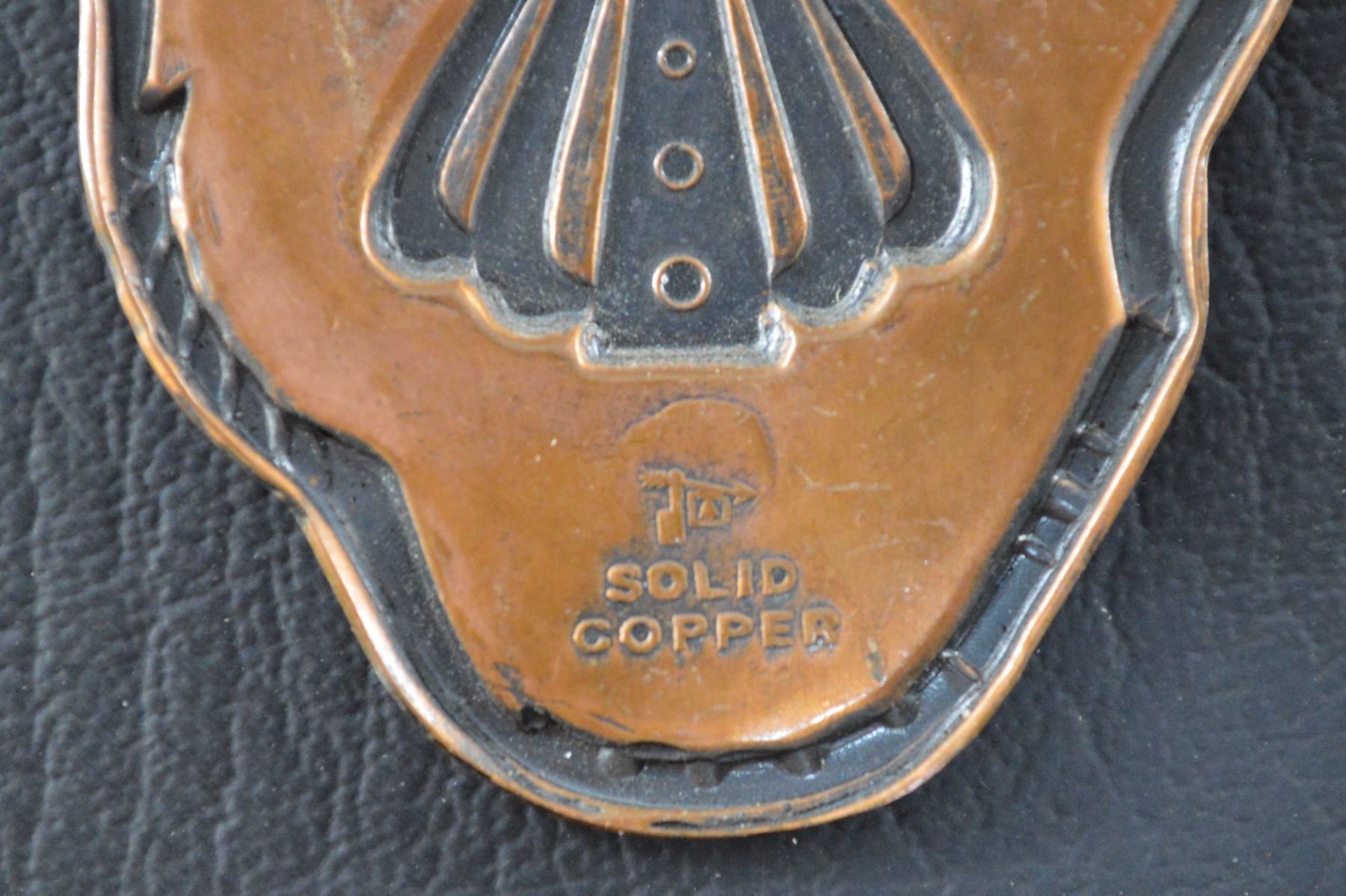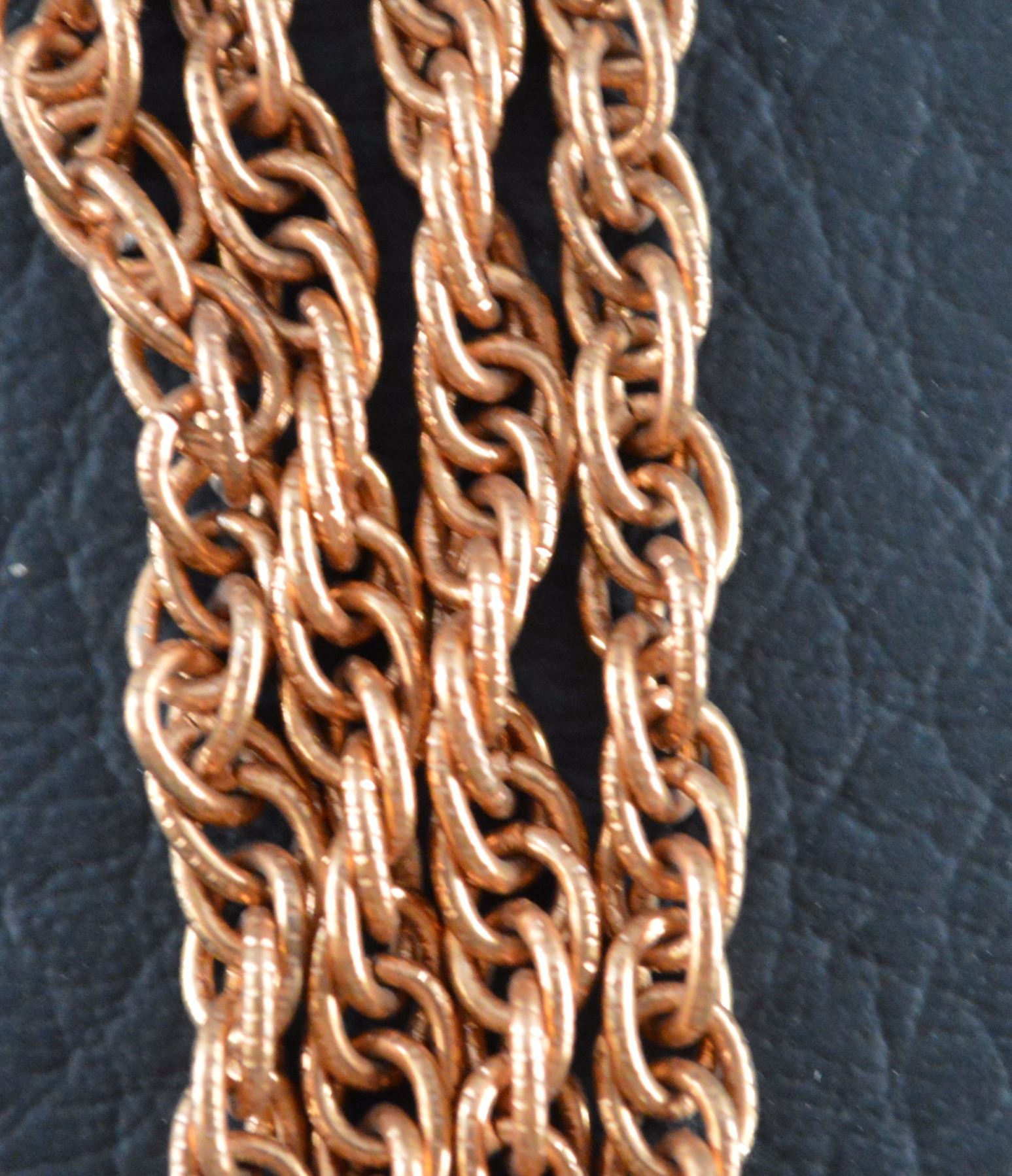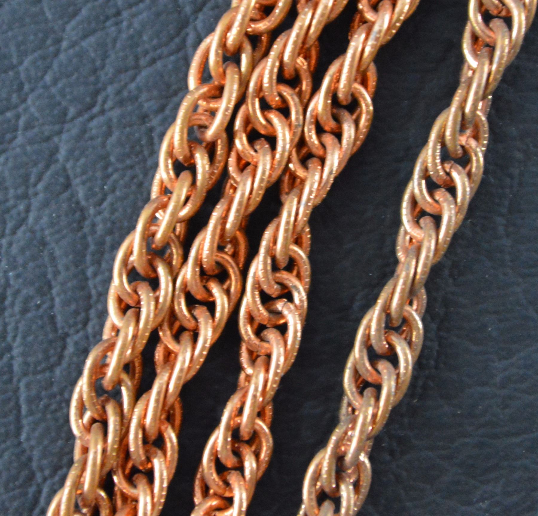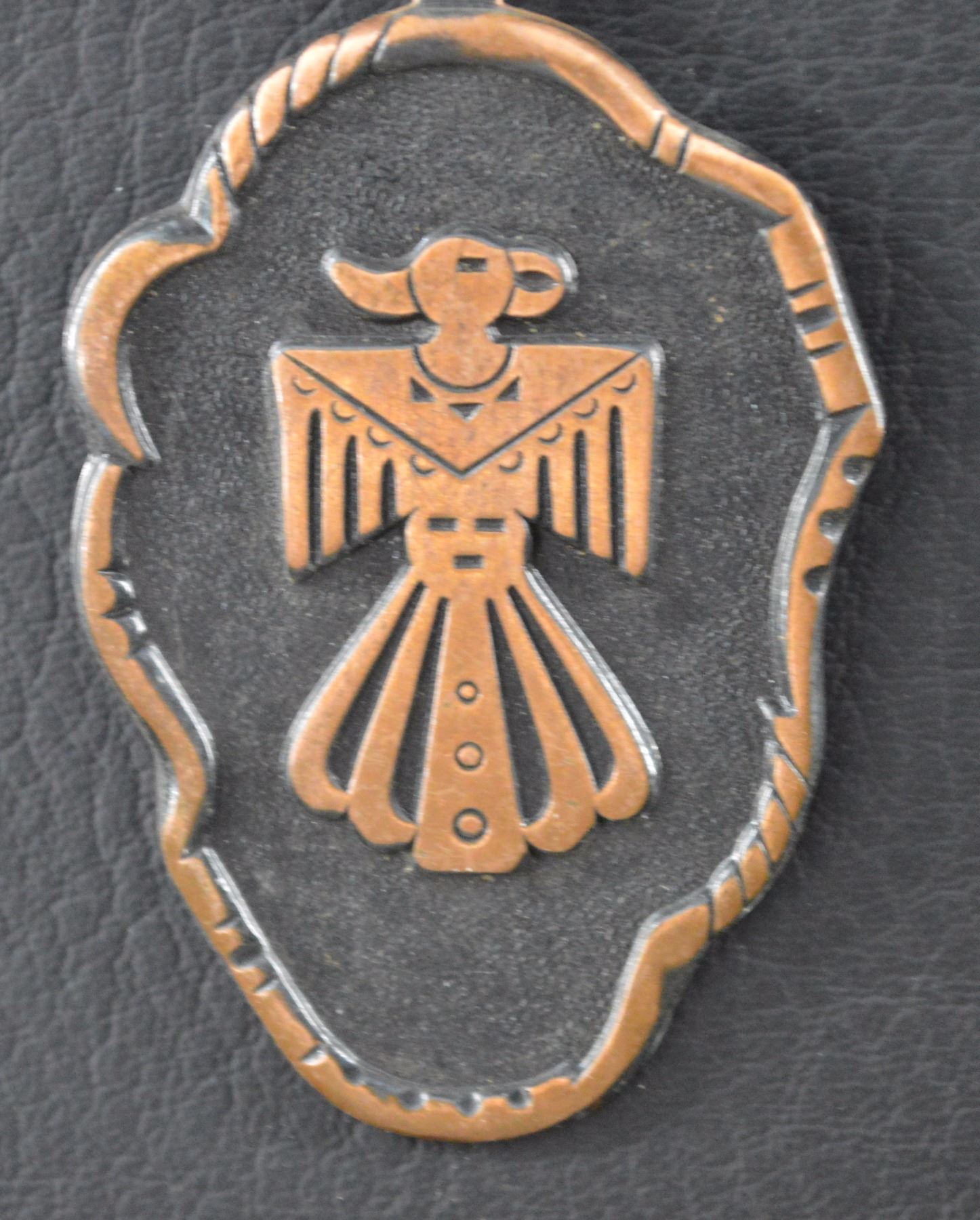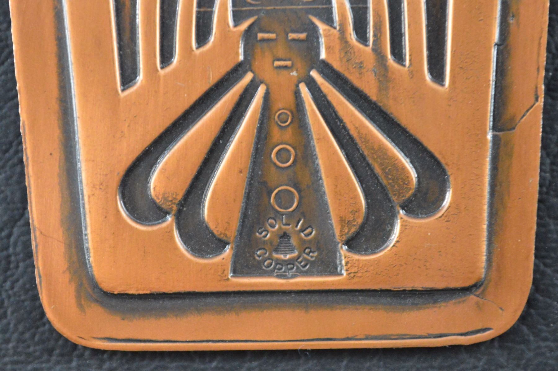 1980-90's. Hand made Copper chain 28" long. Two with bump out bird design, 1.75" x 2.5". Pressed Anasazi style design with green stone, 2" x 2.5". All have Bell Trading Hallmark