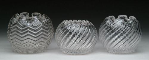 THREE CRYSTAL ROSE BOWLS. Lot consists of one rose bowl with a swirl pattern and box pleated top, one with a swirl pattern with a crimp top and a clear crystal bowl in a herringbone pattern with a box pleated top. SIZE: Range from 4-3/4 in. to 5-1/4 in. dia. CONDITION: Very good to excellent. Collection of Johanna and Sean Billings 5-60878, 5-60971