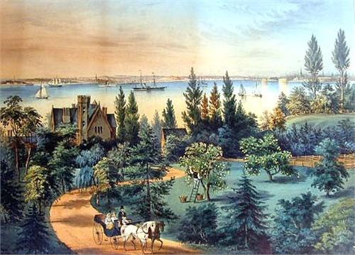 THREE CURRIER AND IVES PRINTS; Depicting "Sunny Side," "The Valley of the Susquehanna," "Niyo Bay," and "The Cattskill Mountains", Each 20"h x 15"w Together with a print of Portland, Maine Largest 23"h x 17"w