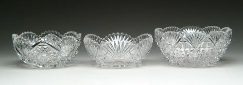 THREE CUT GLASS BOWLS. All are cut in hobstar and fan pattern with one having a central hobstar design with fan pattern around the top. SIZE: 8 in. dia to 9 in. dia. CONDITION: Minor edge roughness to two bowls and minor interior surface scratches to the other, otherwise very good. Estate of Edwin Schiebel Sr. 5-60212, 5-60213