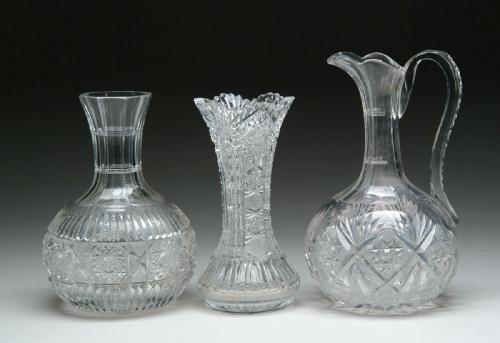 THREE CUT GLASS ITEMS. Crosshatch and fan pattern ewer with cut glass applied handle, a cut glass water carafe in hobstar with fluting and a cut glass vase with hobstar and notched fluting. SIZE: Ewer is 9-3/4 in. t. Carafe is 8-1/4 in. t. Vase is 8 in. t. CONDITION: Ewer has a chip and crack to spout. The carafe and vase are very good to excellent. Estate of Edwin Schiebel Sr. 5-60138, 5-60166