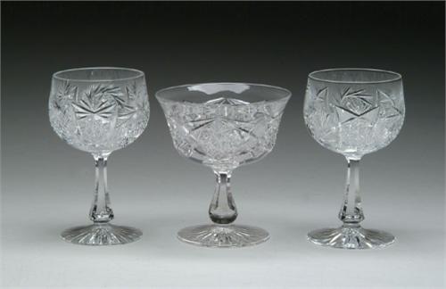 THREE CUT GLASS ITEMS. Lot consists of two water goblets cut in pinwheel pattern and a signed "Clark" sherbet cut in hobstar pattern. SIZE: Goblets are 6 in. t and sherbet is 5-1/4 in. t. CONDITION: Very good to excellent. Estate of Edwin Schiebel Sr. 5-60111