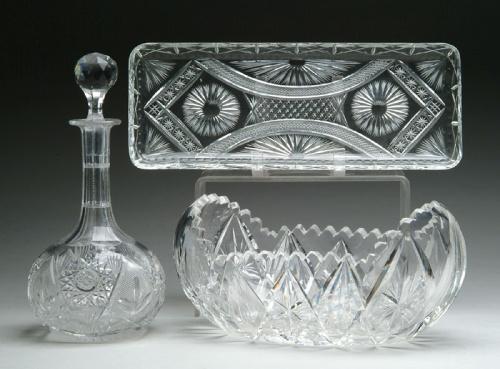 THREE CUT GLASS ITEMS. Lot consists of a lovely cut glass rectangular tray cut in the sunburst and feathered fan pattern, nice decanter cut in hobstar and fan pattern with lapidary stopper and a heavily cut glass oblong bowl in hobstar and fan pattern. SIZE: Tray: 14 in. x 5-1/2 in. w. Decanter: 12 in. t. Bowl: 11-1/2 in. l x 6 in. t. CONDITION: Decanter has staining to interior, bowl has minor edge roughness, otherwise very good to excellent. 5-60739, 5-60742, 5-60745