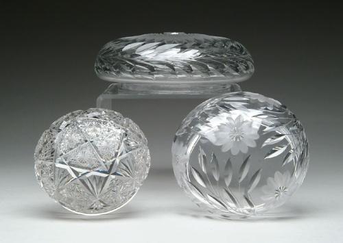 THREE CUT GLASS SHADES. 1) Large shade cut in floral motif with a garland of intaglio cut leaves. SIZE: 6-3/4 in. fitter x 9-1/4 in. dia. 2) Shade cut in hobstar and feathered fan pattern. SIZE: 6 in. dia. 3) Shade intaglio cut in floral design. SIZE: 7 in. dia. CONDITION: Small flakes to two of the shade rims, one has flake to side of shade, otherwise very good. Estate of Edwin Schiebel Sr. 5-60110, 5-60117