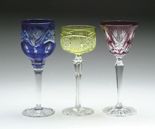 THREE CUT GLASS STEMS. Lot consists of three beautiful cut glass wines. Amethyst cut to clear, citron cut to clear and cobalt cut to clear all have clear crystal stems. SIZE: Approx. 8 in. t. CONDITION: Very good to excellent. Estate of Edwin Schiebel Sr. 5-60107, 5-60186, 5-60187