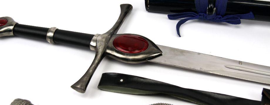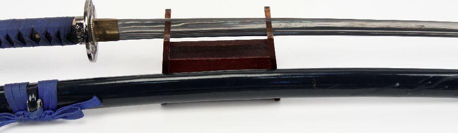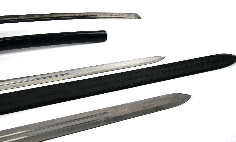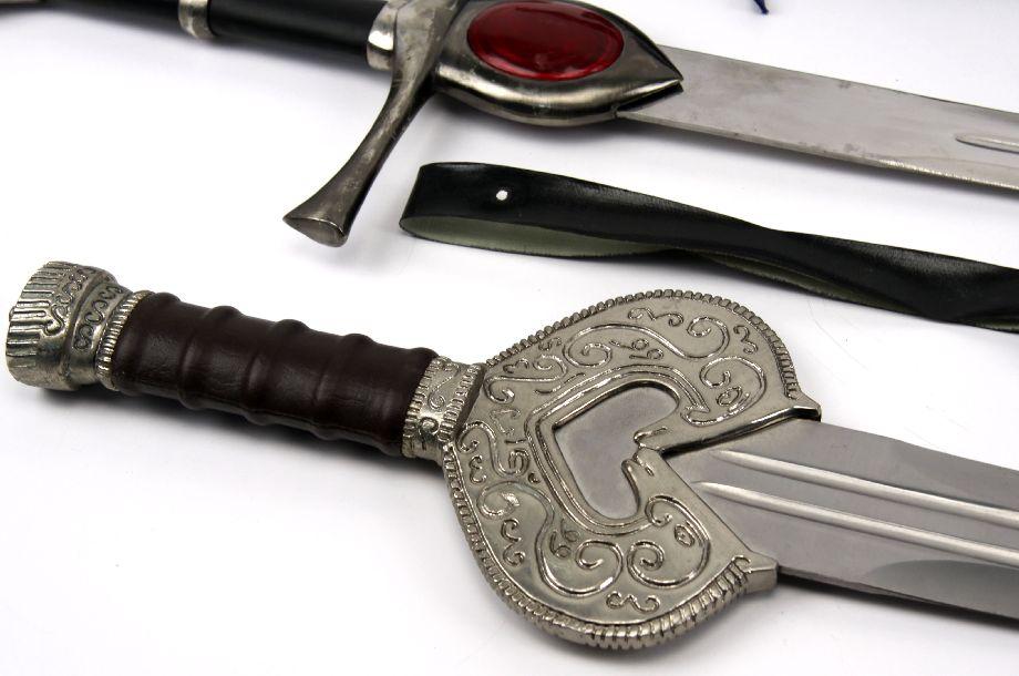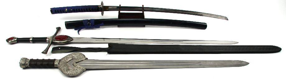Grouping of three decorative fantasy swords. Two broad sword style, and one Japanese style. Blades range from 30 to 35 inches in length. Overall good condition.