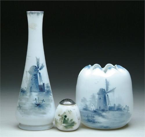 THREE DELFT GLASS ITEMS.  Lot consists of a rose bowl with blue Delft decoration of a windmill, a vase with blue Delft decoration of a windmill and a salt shaker with green Delft decoration of a windmill.  SIZE:  5 in. t, 9-1/2 in. t and 2-1/2 in. t respectively.  CONDITION:  Fitter of salt shaker has been ground, otherwise very good to excellent.  Collection of Johanna and Sean Billings  5-60945