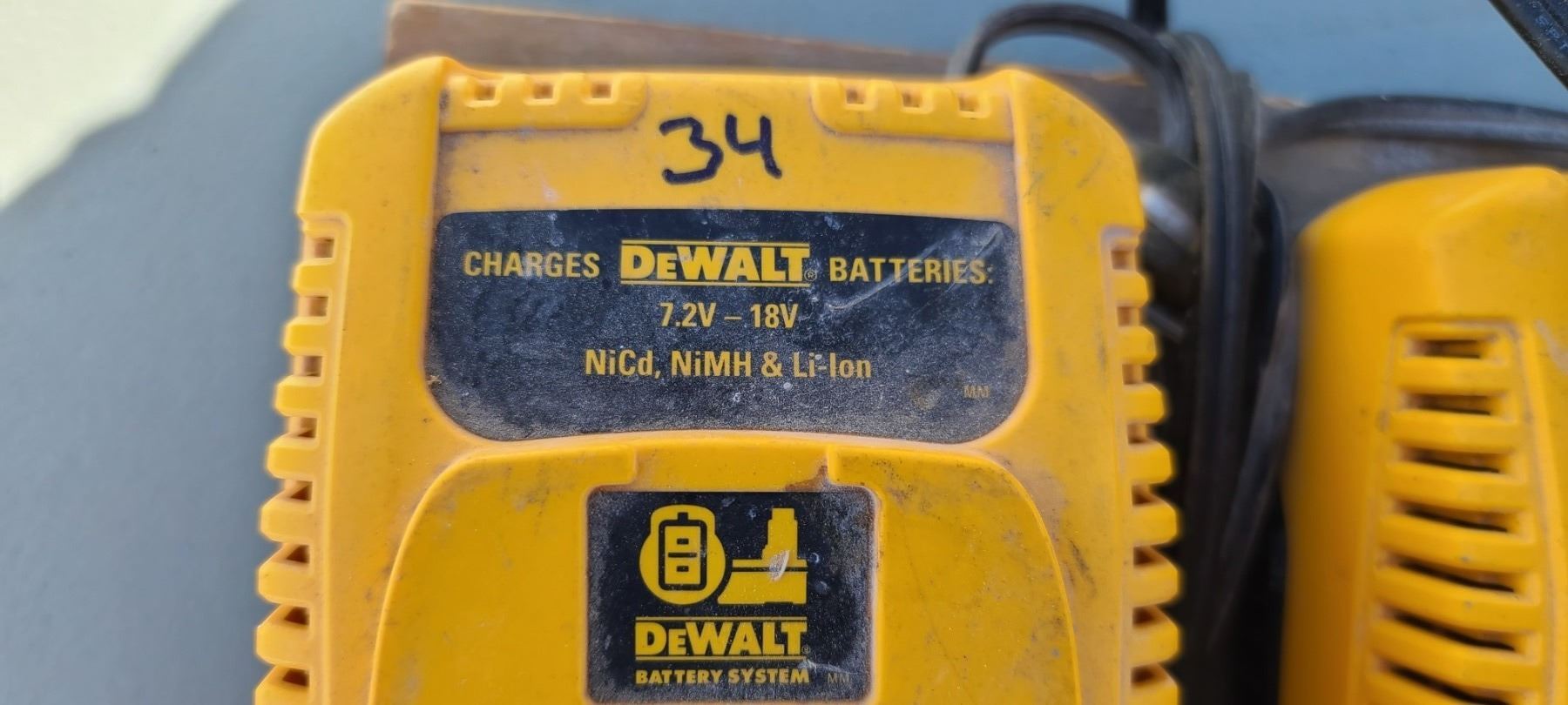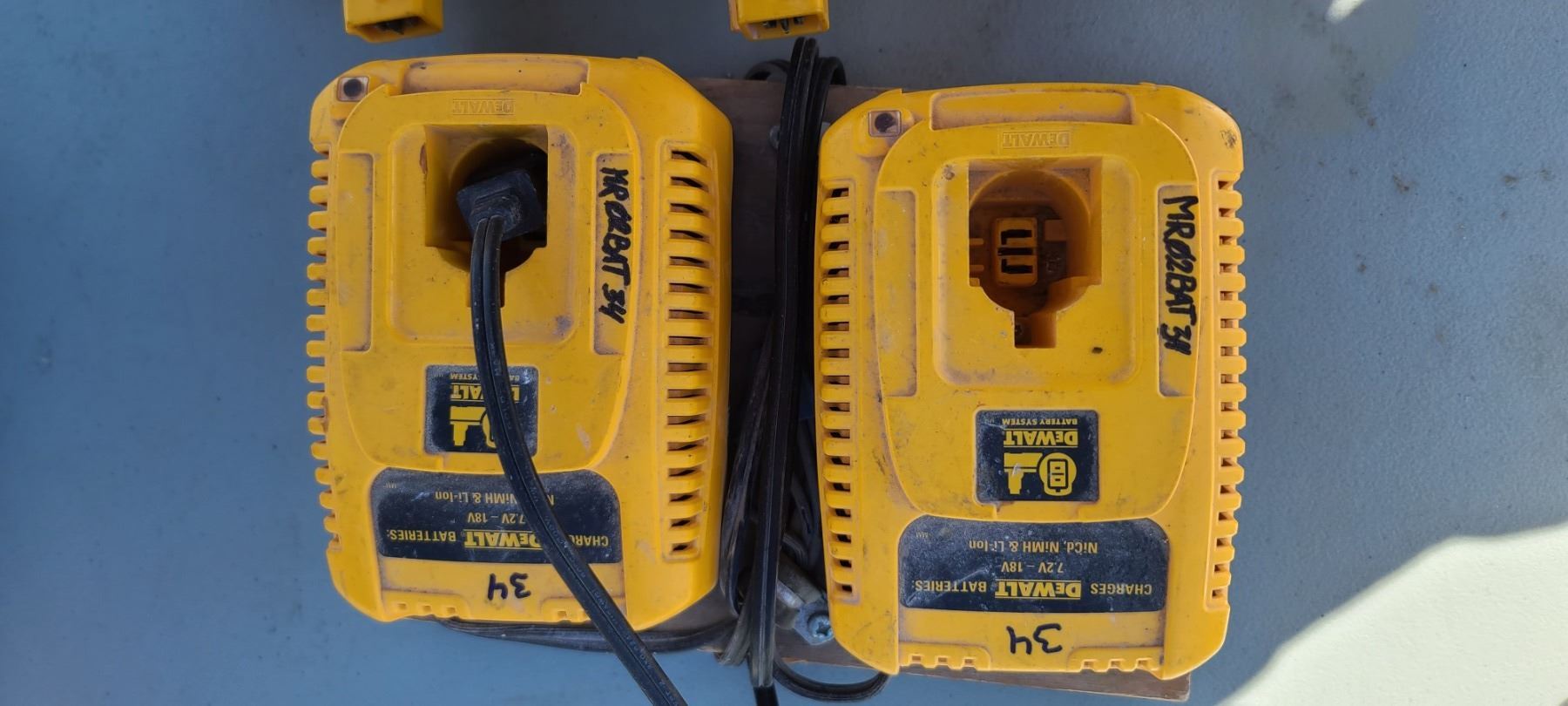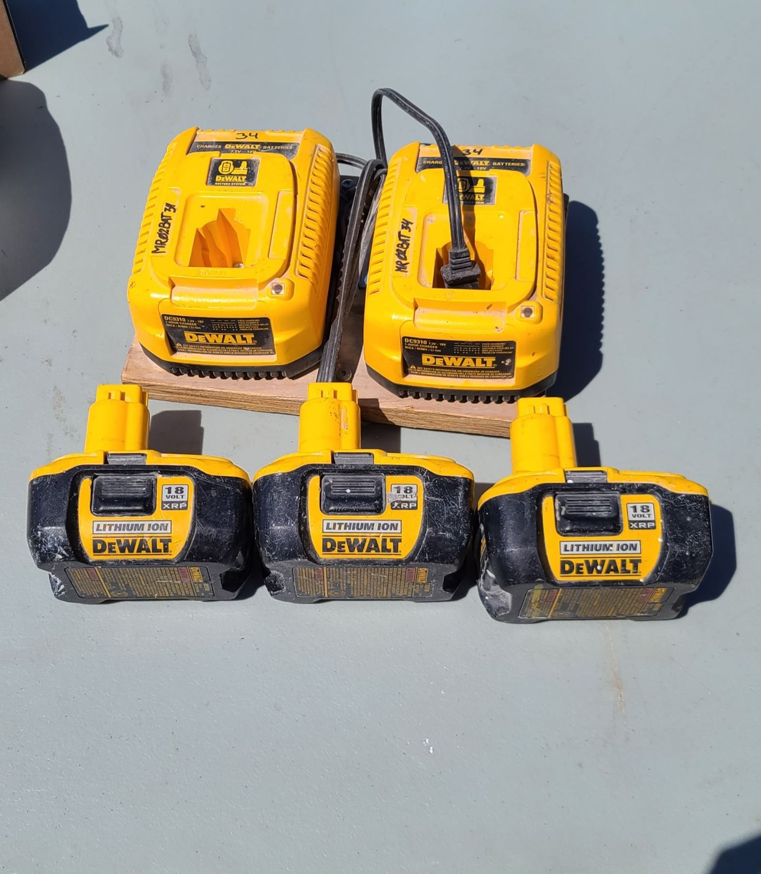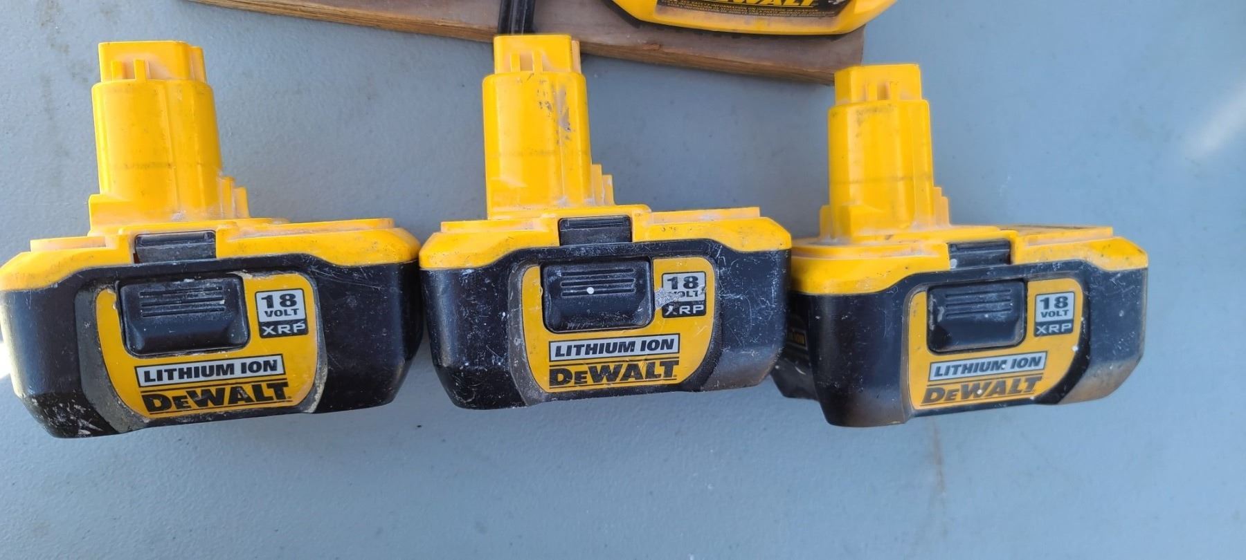 THREE DEWALT BATTERIES AND TWO CHARGERS
