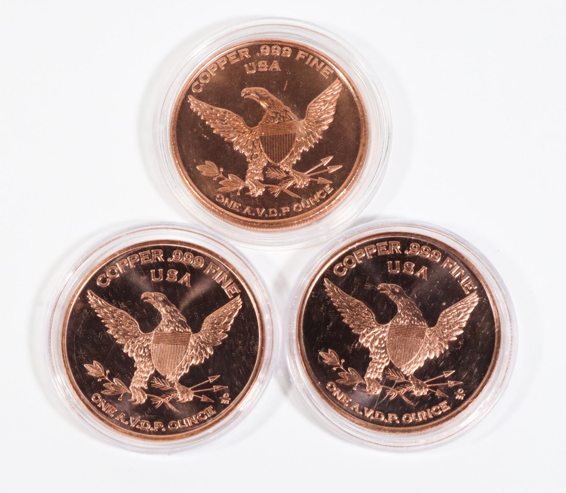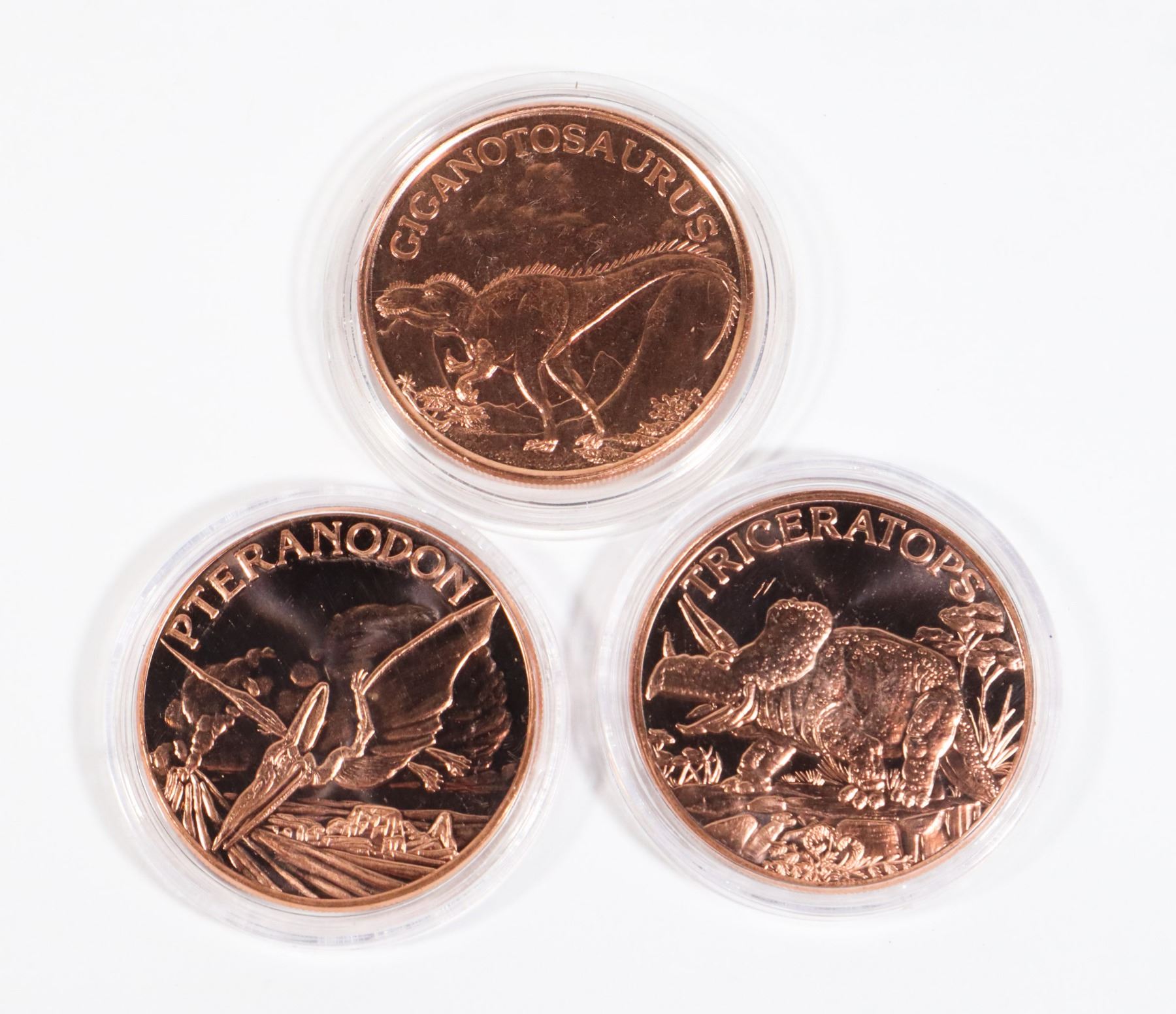 THREE DINOSAUR 1-OZ .999 FINE COPPER ROUNDS IN