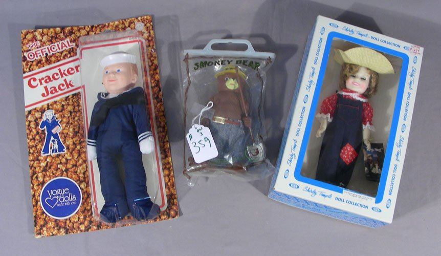 Ideal Shirley Temple, a Vogue doll made with love "The Official Cracker Jack" and a Smokey the Bear plastic doll in original bag.