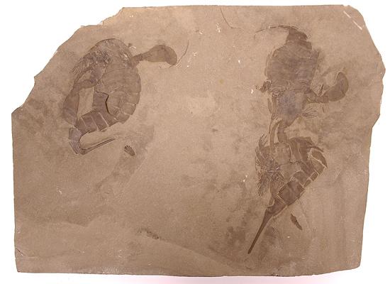 THREE EURYPTERIDS, SEA SCORPIONS. Eurypterids, also known as sea scorpions, were fierce predators in the warm seas 425 million years ago. They grew to over 6 feet long and easily hunted the slow moving armored fish of that era. Eurypterids were related to scorpions and were probably the first animal to leave the sea and crawl out on dry land. These three highly detailed sea scorpions, Eurypteurus remipes come from the famous 425 million year old Fiddler's Green Quarry of Herkimer County, New York. The largest complete specimen is 5 inches long having both paddles, telson (looks like the stinger in a scorpion but was not poisonous) and two of the six walking legs. The other two Eurypterids are 3.5- 4.5 inches long and are fairly complete each missing one of their paddles and one having only a partial telson, but both having several well detailed feather-like walking legs. The delicate walking legs are rarely preserved and all three of these Eurypterids are above average and nicely displayed on a 11 x 8 hard gray matrix.