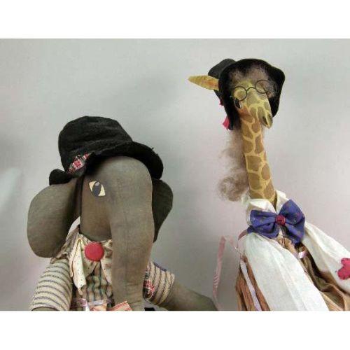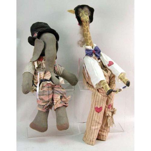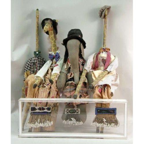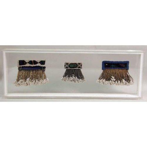 THREE EXAMPLES OF AFRICAN BEADWORK<BR><BR>Framed. Together with a carved and polychrome African mask and four African stuffed animal dolls, comprising an elephant and three giraffes, Framed beadwork: 8-1/2"h x 24-1/2"w x 2-1/2d. 6 pieces