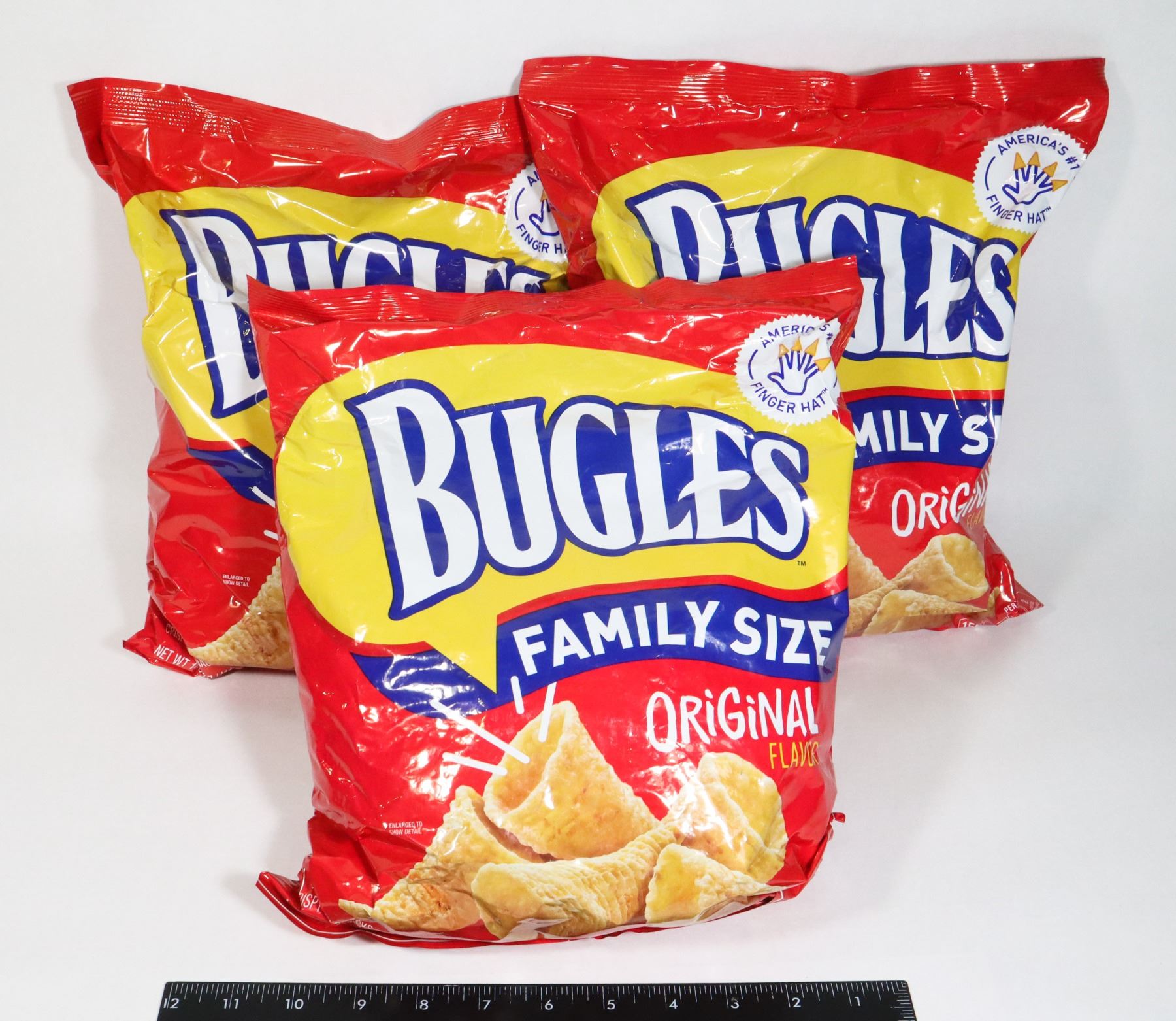 THREE FAMILY SIZED BAGS OF ORIGINAL BUGLES