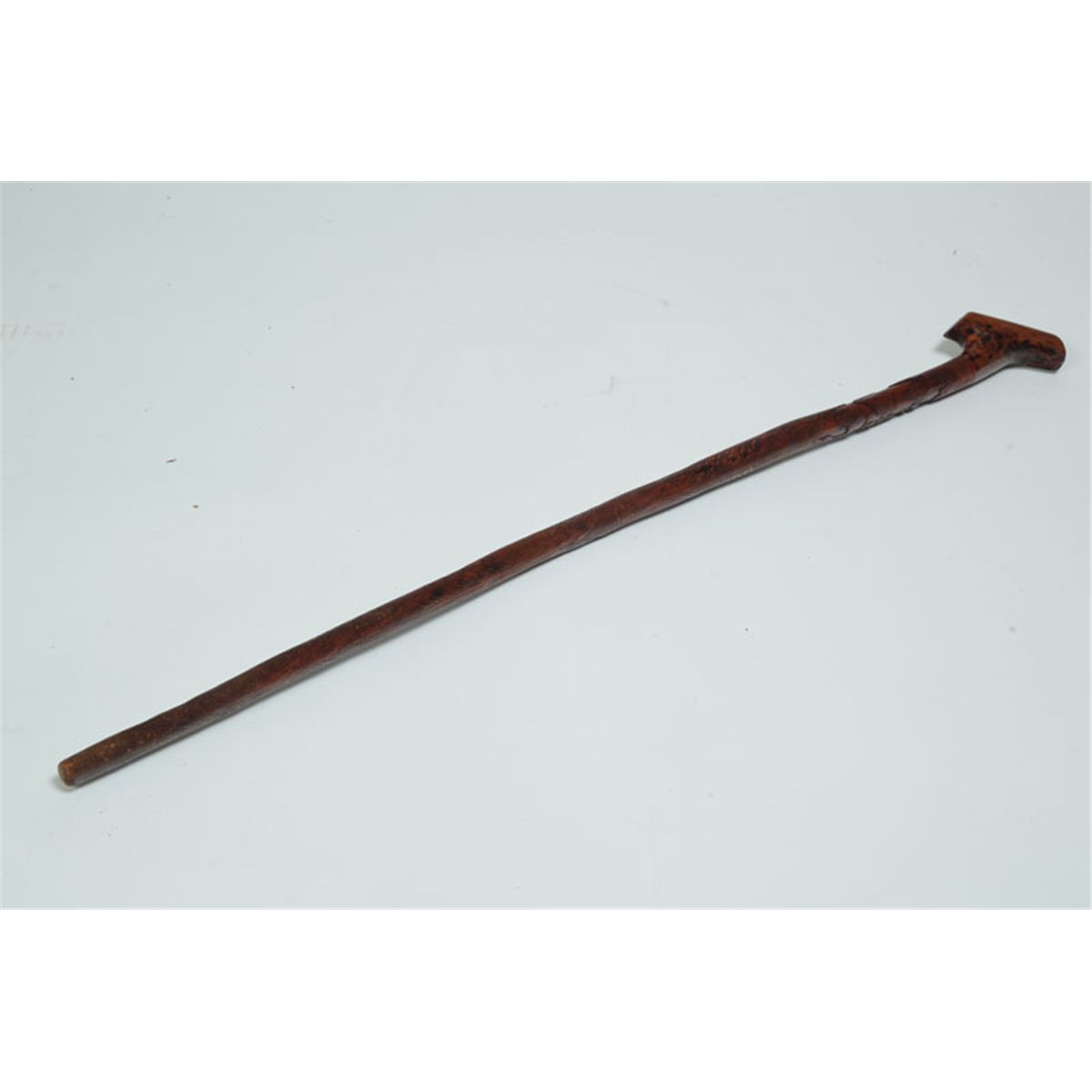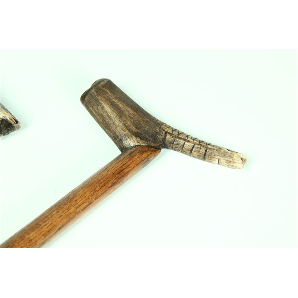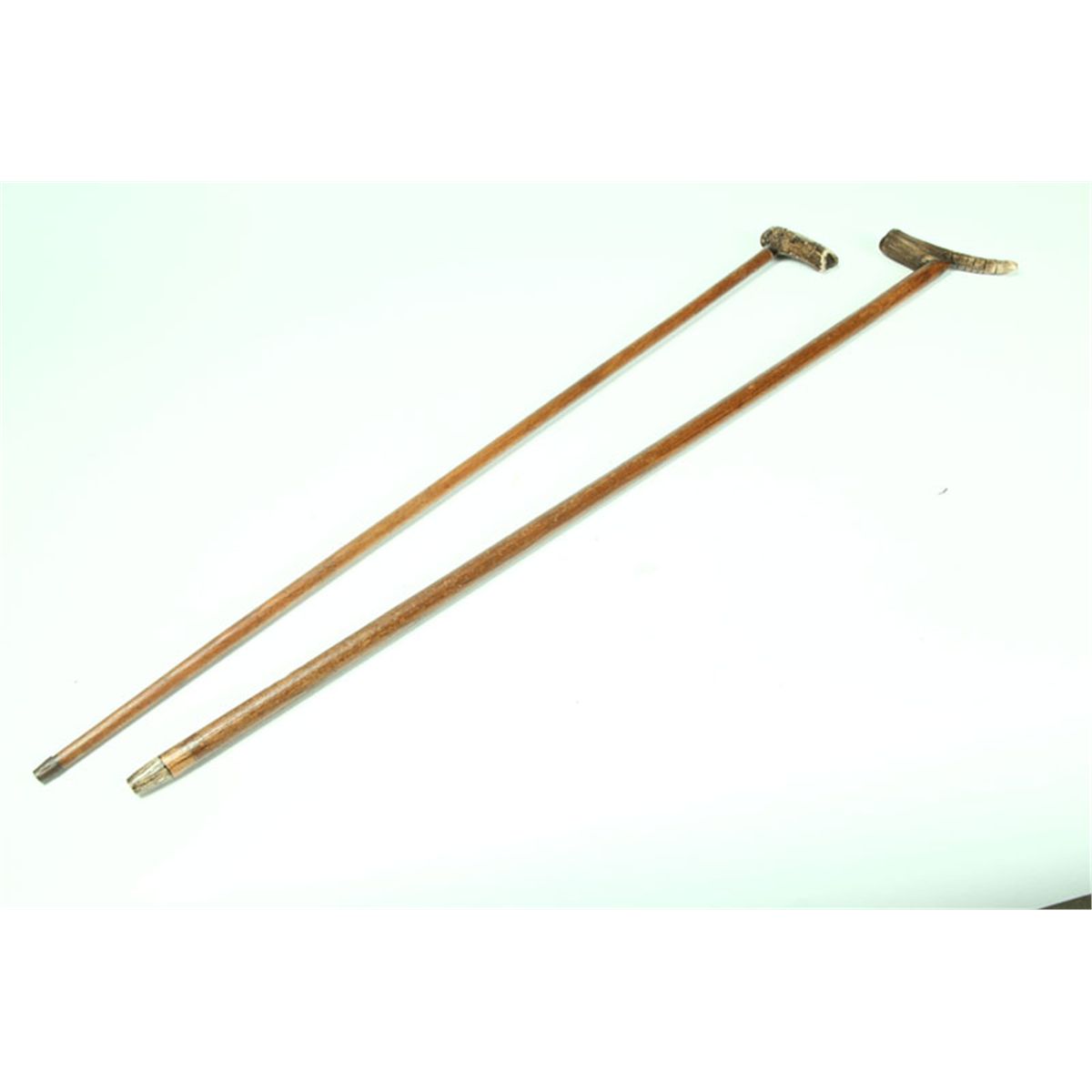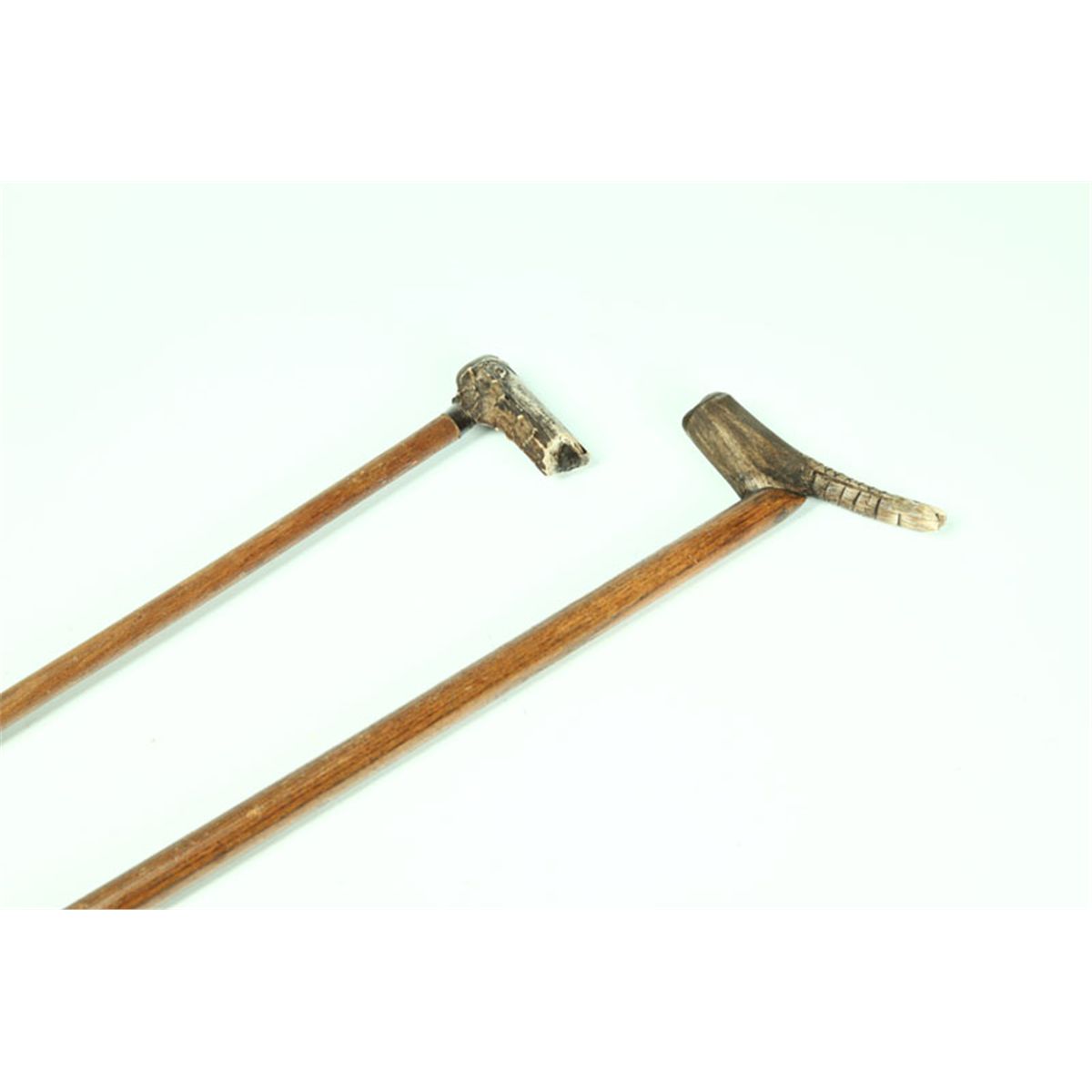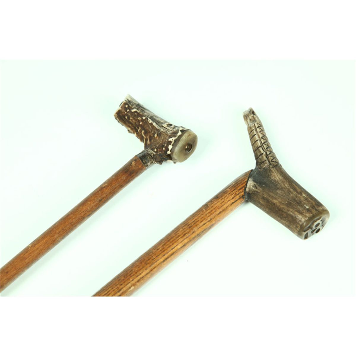 Two are Cincinnati, Ohio, 20th century. Each with antler handles, one with a carved skull. 34 1/2" and 33"l. Another is most likely Mexican, possibly mid 19th century. Elaborately carved, including a Mexican eagle and snake. 32"l.