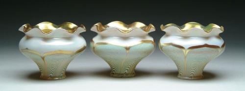 THREE FOSTORIA ART GLASS SHADES. Iridescent green and gold pulled feather decoration on a calcite background with interior gold finish, ruffled edge. Unsigned. SIZE: 5-1/2 in. dia x 2-1/4 in. fitter. CONDITION: Minor roughness to fitter, otherwise very good to excellent. 5-60729