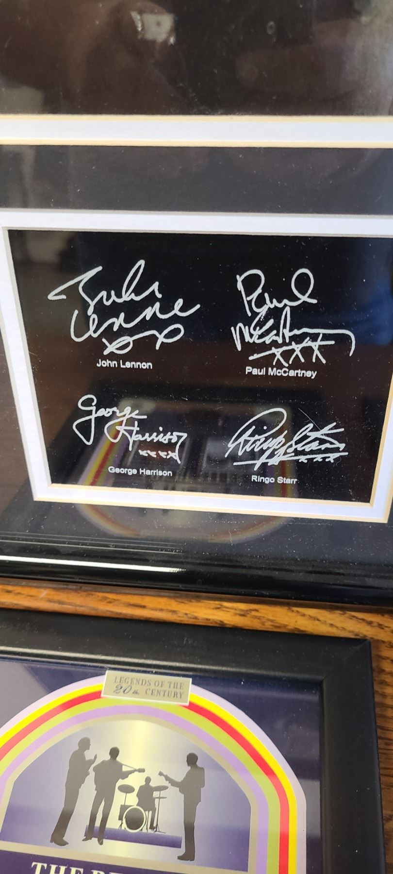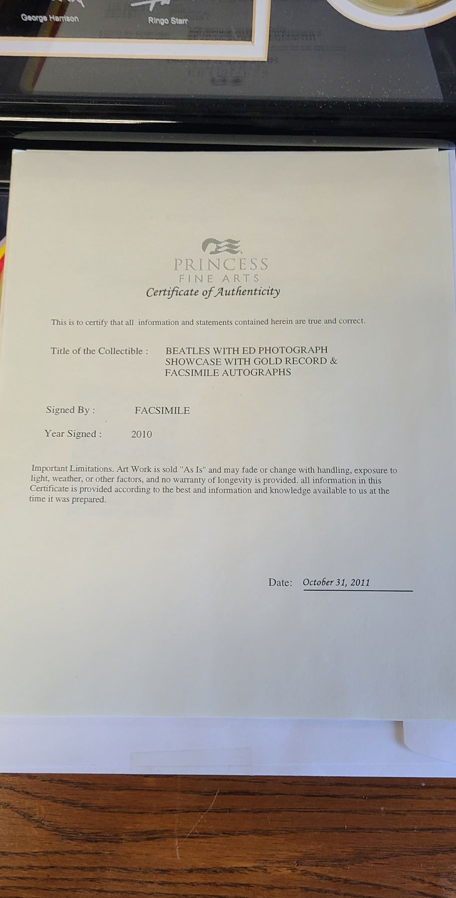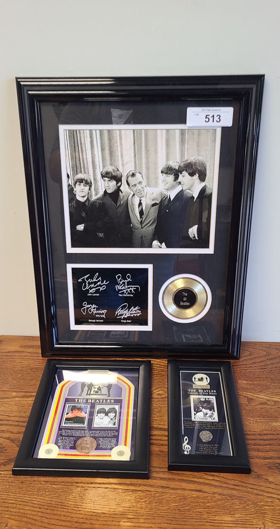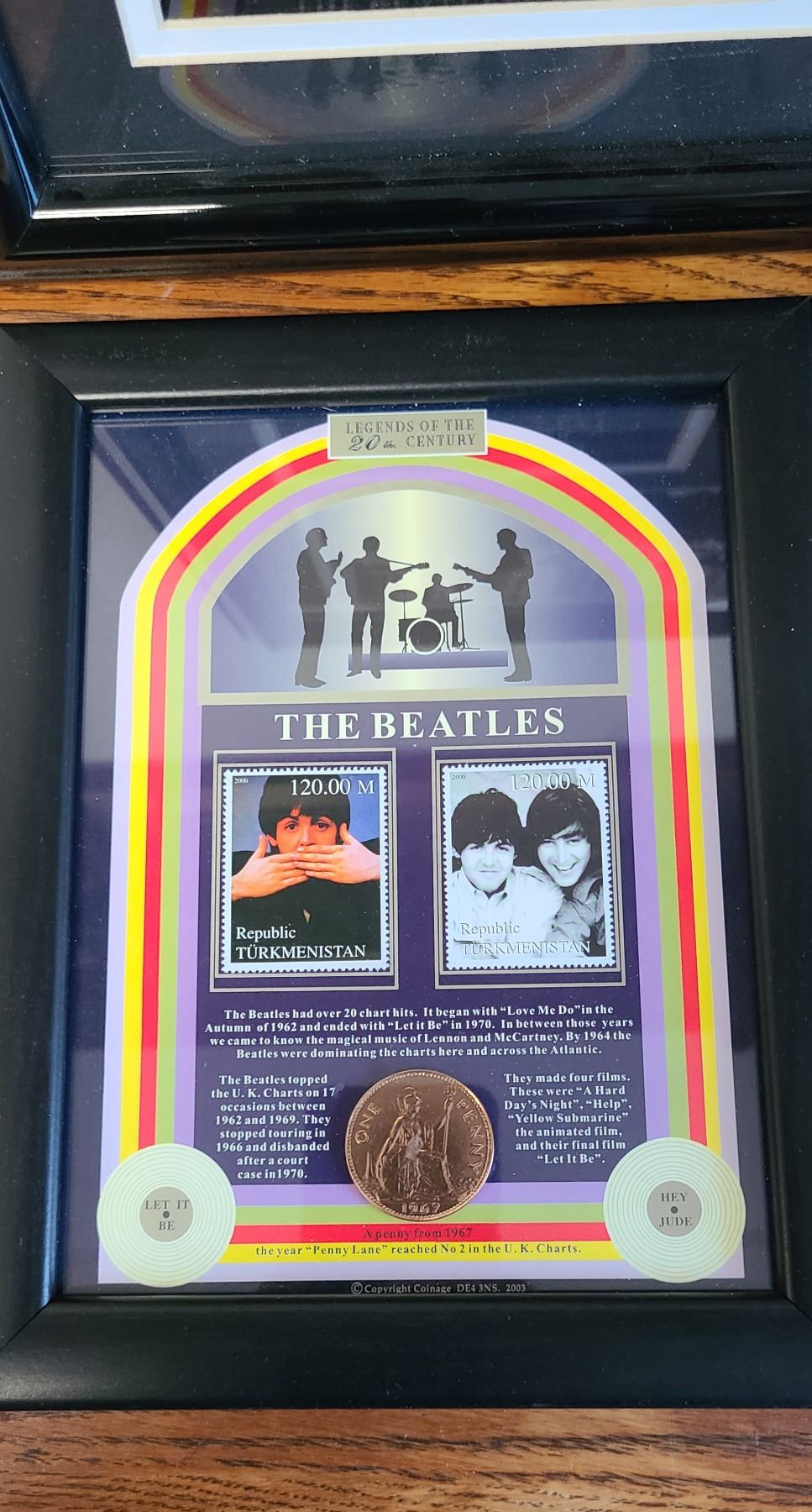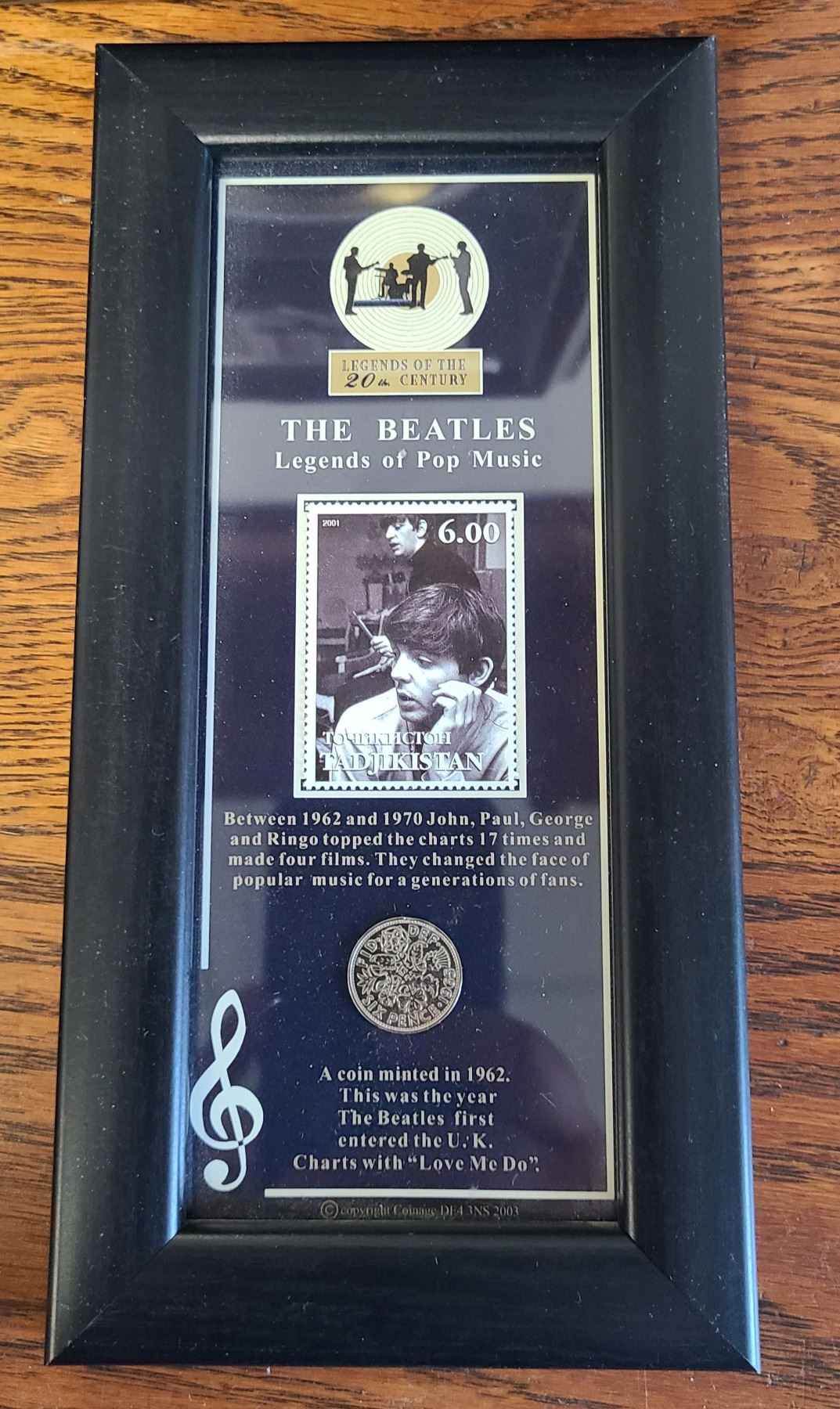 FRAMED BEATLES PRINT WITH ED SULLIVAN & MINI GOLD RECORD & FACSIMILE AUTOGRAPHS WITH COA, BEATLES LEGENDS OF POP MUSIC STAMP & 1962 COIN, BEATLES TWO STAMPS & 1967 PENNY