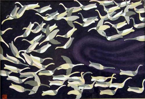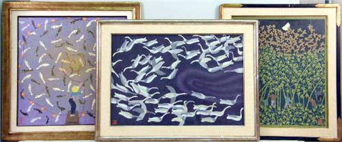 One depicting a fisherman and net, the second flying geese, the third birds in a net. 21 1/2"h x 21"w, 22"h x 18"w, and 18"h x 26"w