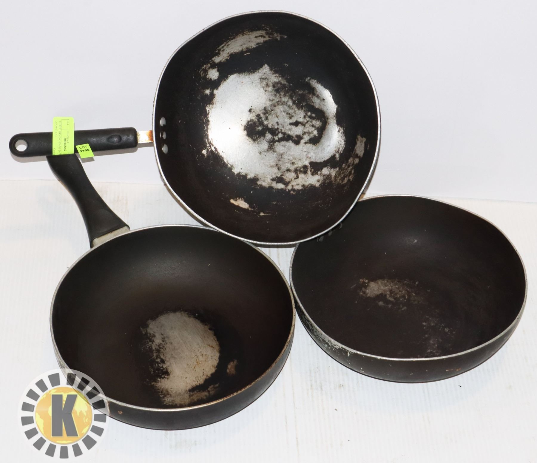 THREE FRYING PANS (APPROX 11" DIAMETER)