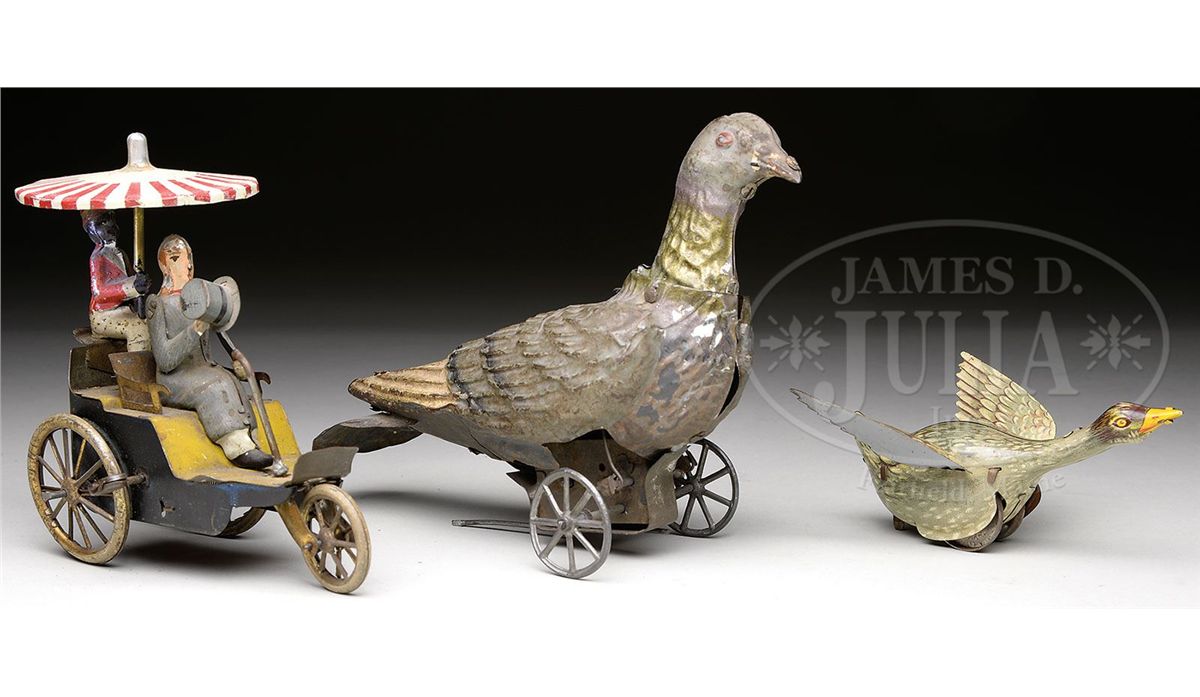 1) Lehmann "Onkle-Onkle" windup with tipping hat and spinning umbrella. 2) A West German windup lithographed duck. 3) Circa 1900 hand painted tin pigeon toy rolls forward with squeak bellow action. SIZE: Largest 7-1/2" l. CONDITION: 1) Replaced umbrella. 3) Bellows not working. Otherwise lot averages good. 1-13486