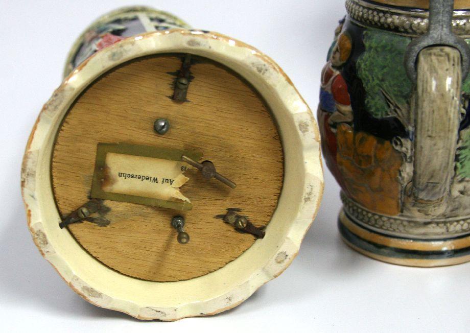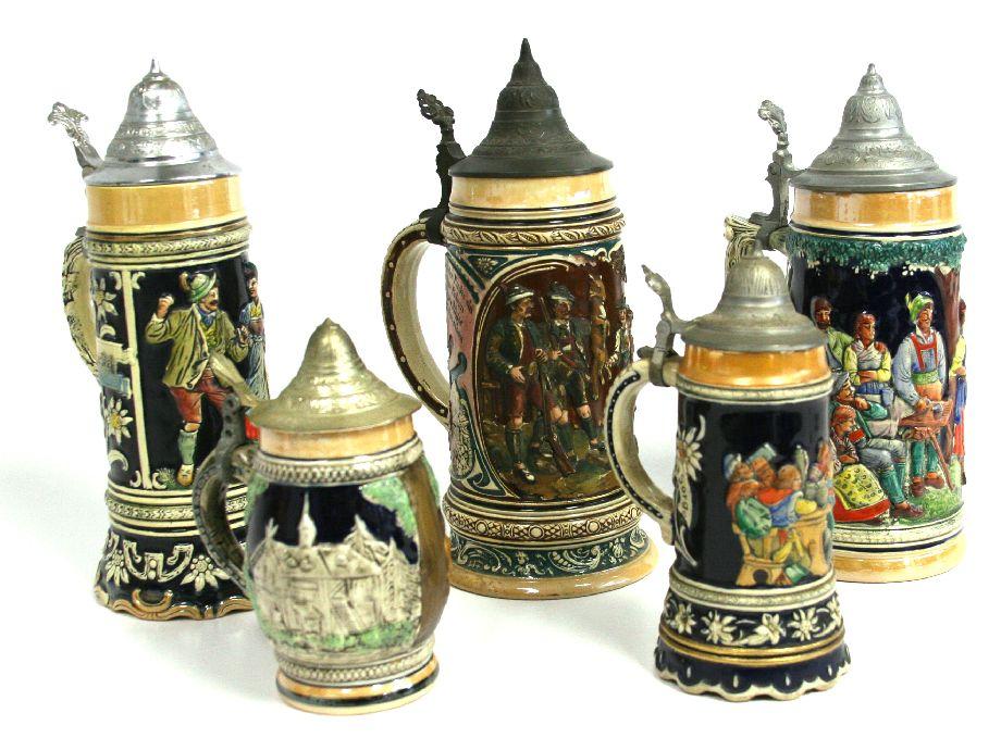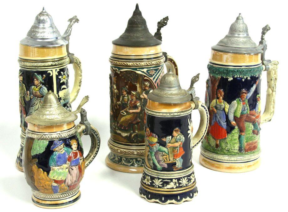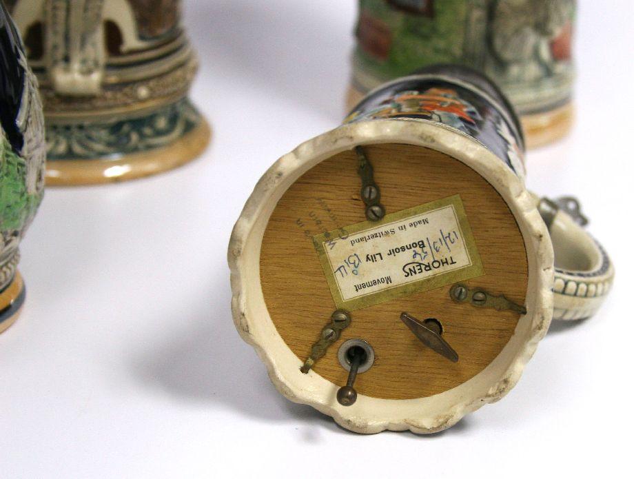 Grouping of hand painted steins c. 1950's, heights: 11, 11.5 and 7 inch. Two steins with music box at base in working condition height: 8 and 11.5 inch.