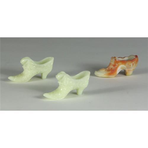 Three molded glass shoes/slippers. Two are Daisy and Button custard glass cat slippers, marked ''OVC'' on bottom, 5.5''. The third is an orange swirl satin glass shoe/slipper, rose on toe, 5.5'', small flea bite to toe noted.